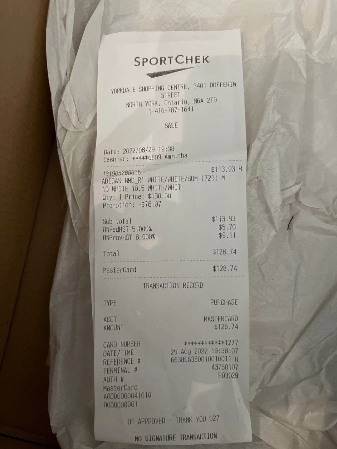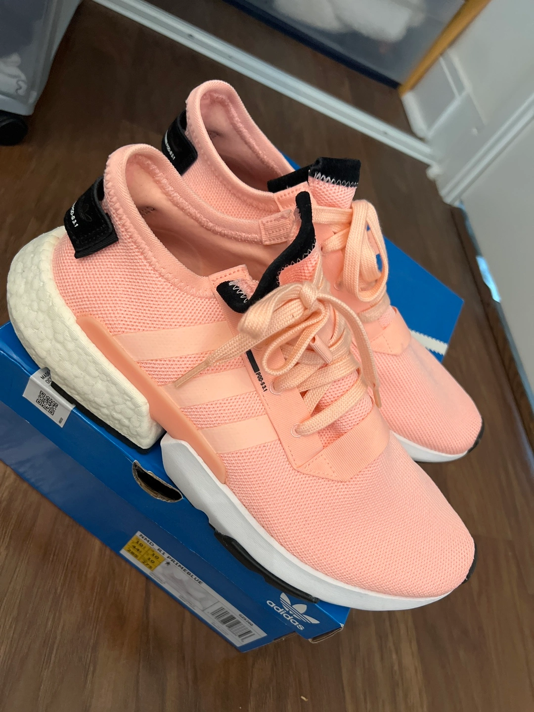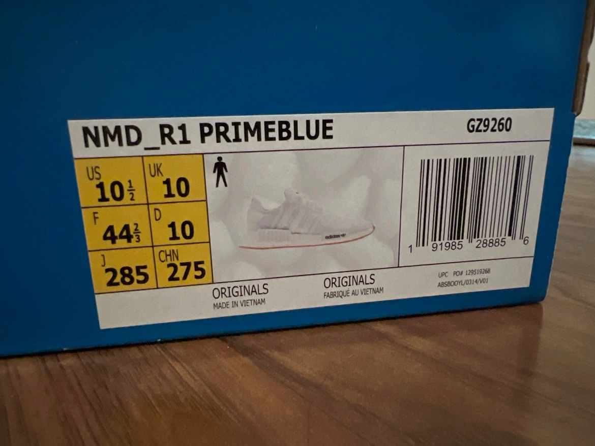 Adidas NMD_R1 Primeblue sneakers in size 10.5 US men's. The sneakers are pink and white with black accents. They are brand new, never worn and come with the original box with receipt.