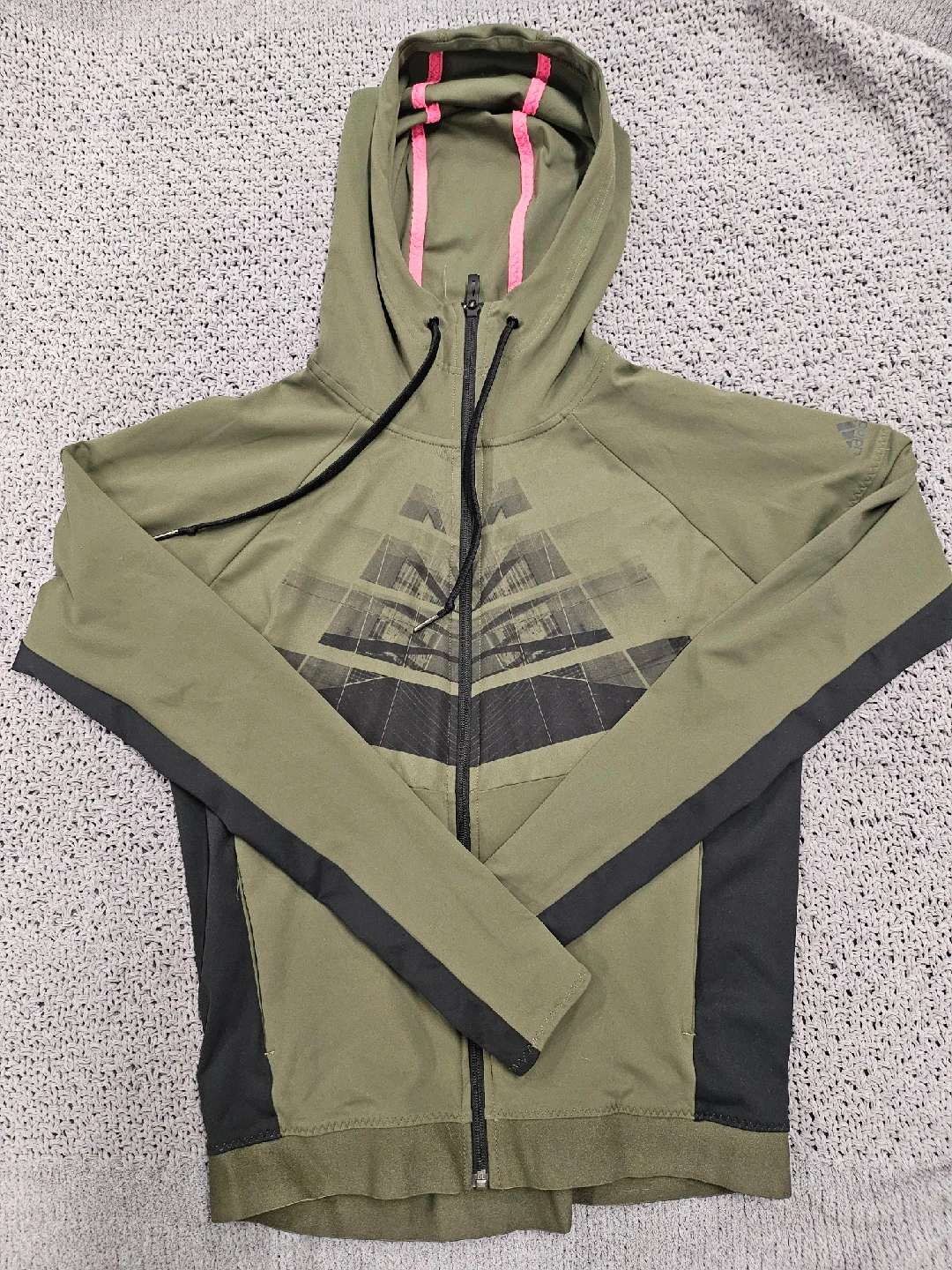 15Adidas zip-up hoodie in olive green with black accents! It's in great condition and ready for a new home. Perfect for layering or wearing on its own for a sporty look