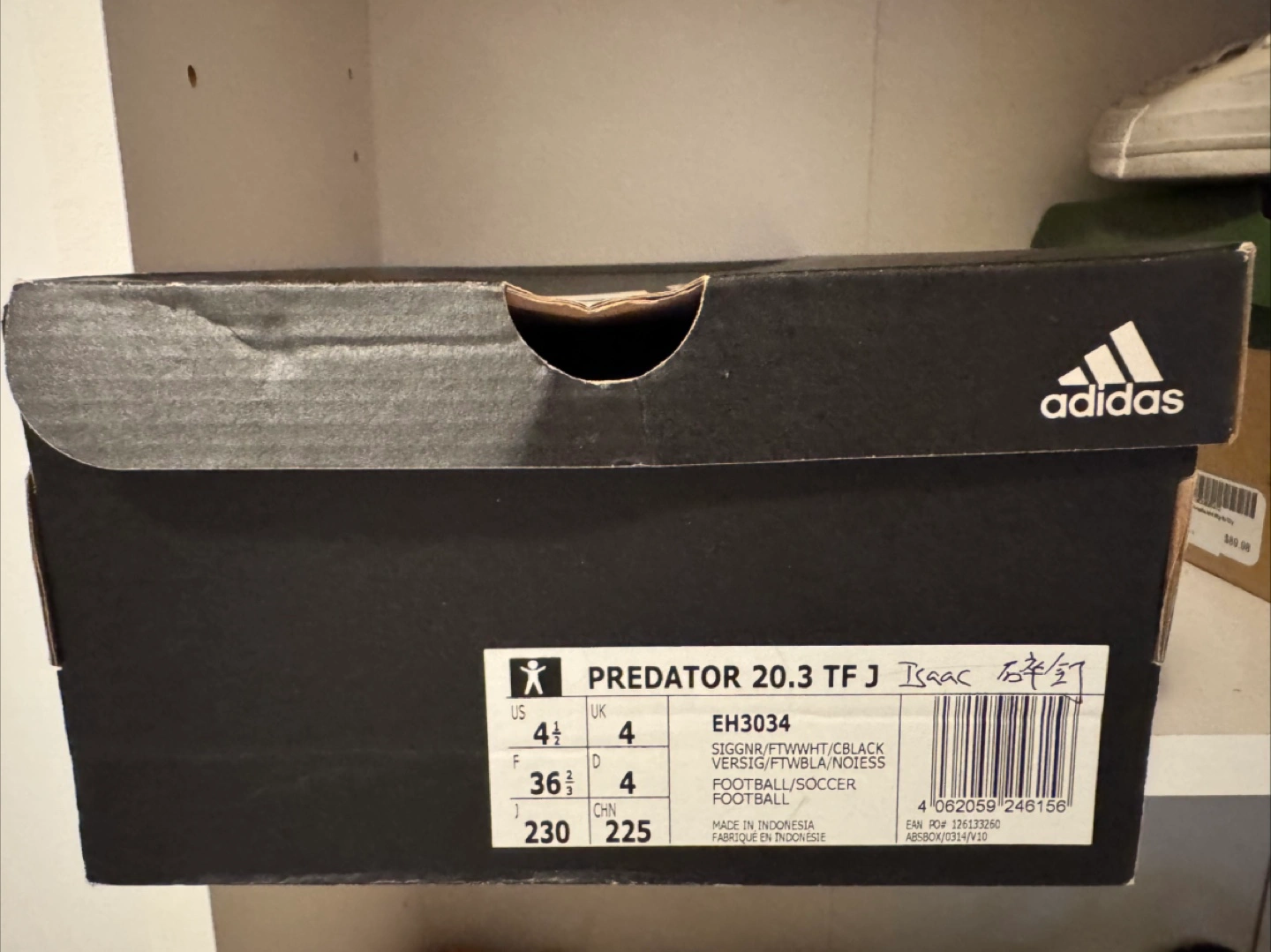 10Selling a pair of Adidas Predator 20.3 TF J soccer shoes in US size 4.5! These are in great condition and come with the original box. Perfect for young soccer players looking for a reliable and stylish pair of cleats.