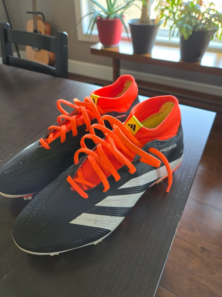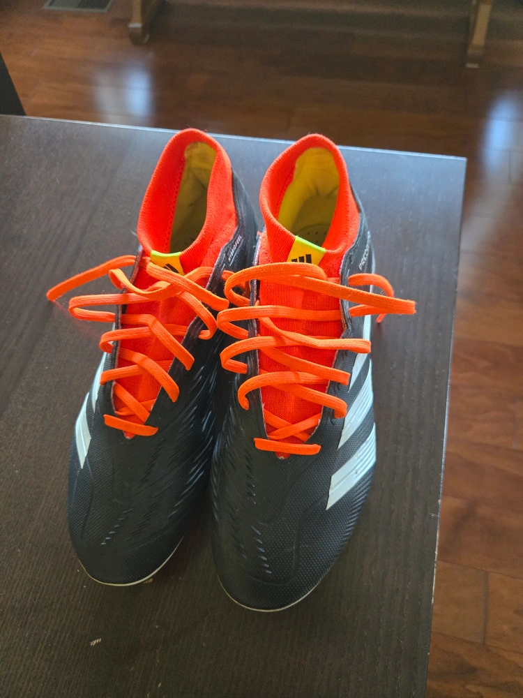 81Selling a pair of Adidas Predator soccer cleats! They're in great shape and ready for the field. The vibrant orange laces really pop against the black and white design, making them stand out. Perfect for your next game or practice size US 8