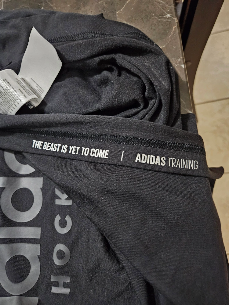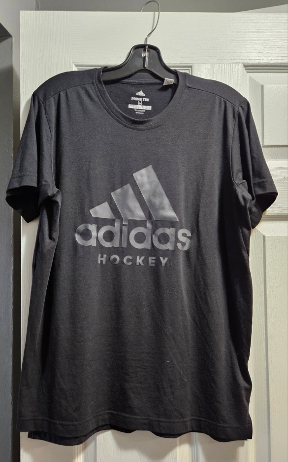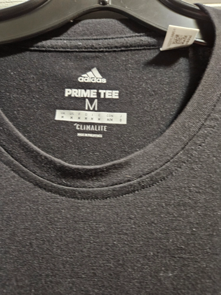 Selling a black Adidas Prime Tee in size medium. It's made of 97% polyester and 3% elastane. The shirt is designed with Climalite technology, making it lightweight and breathable for training or everyday wear. It also features Adidas Hockey logo.