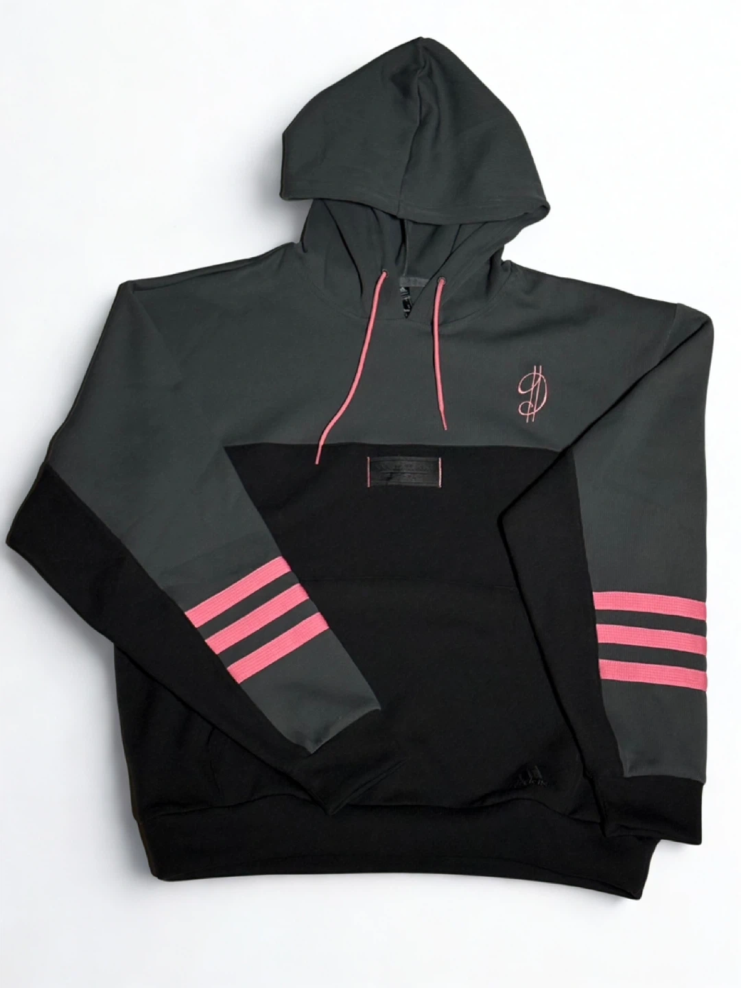 15Here's an Adidas Primegreen hoodie in size small. It's a stylish colour-blocked design with pink accents on the sleeves.