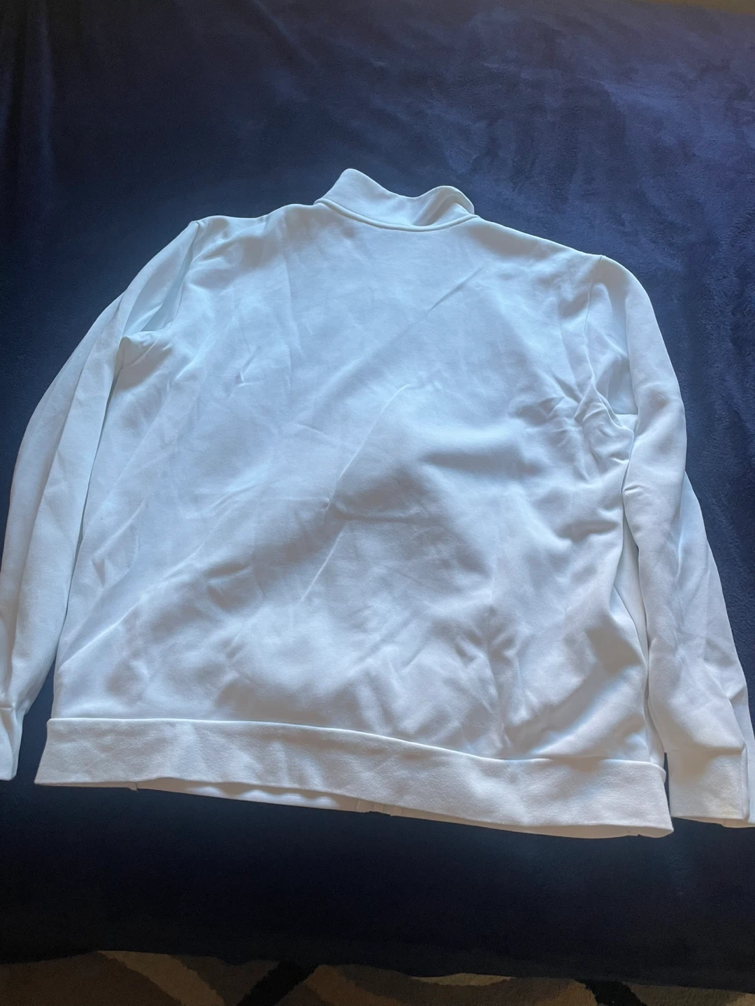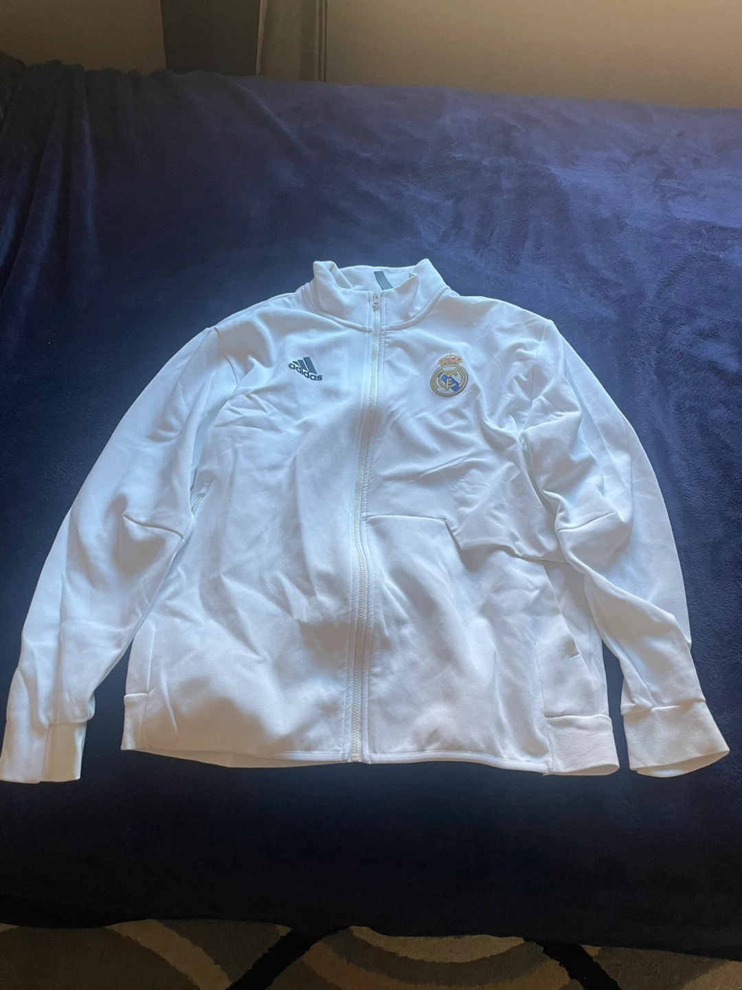 60Selling a white Adidas jacket with the Real Madrid logo. It's in great condition and perfect for any fan!