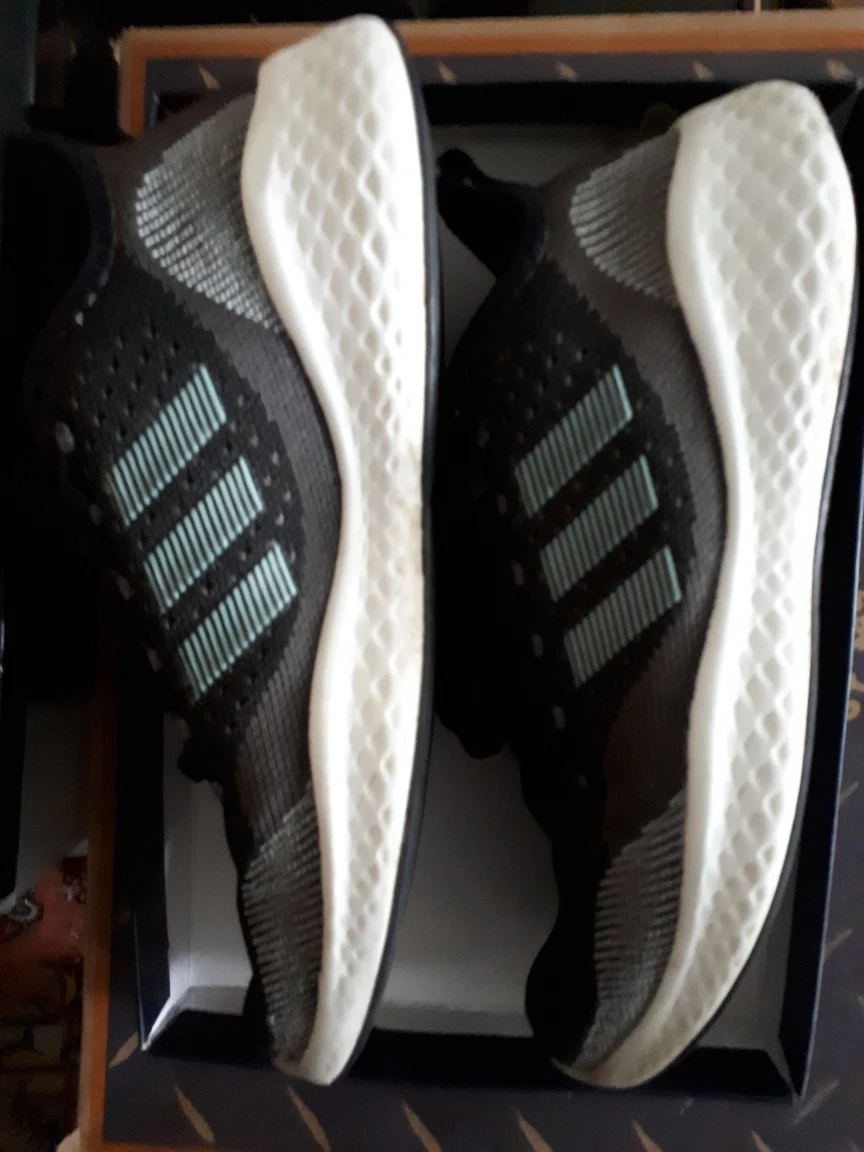 Here are some Adidas running shoes! They're black and in used condition. There is also a Hazzys logo on the insole of the shoe. size 6.5 men