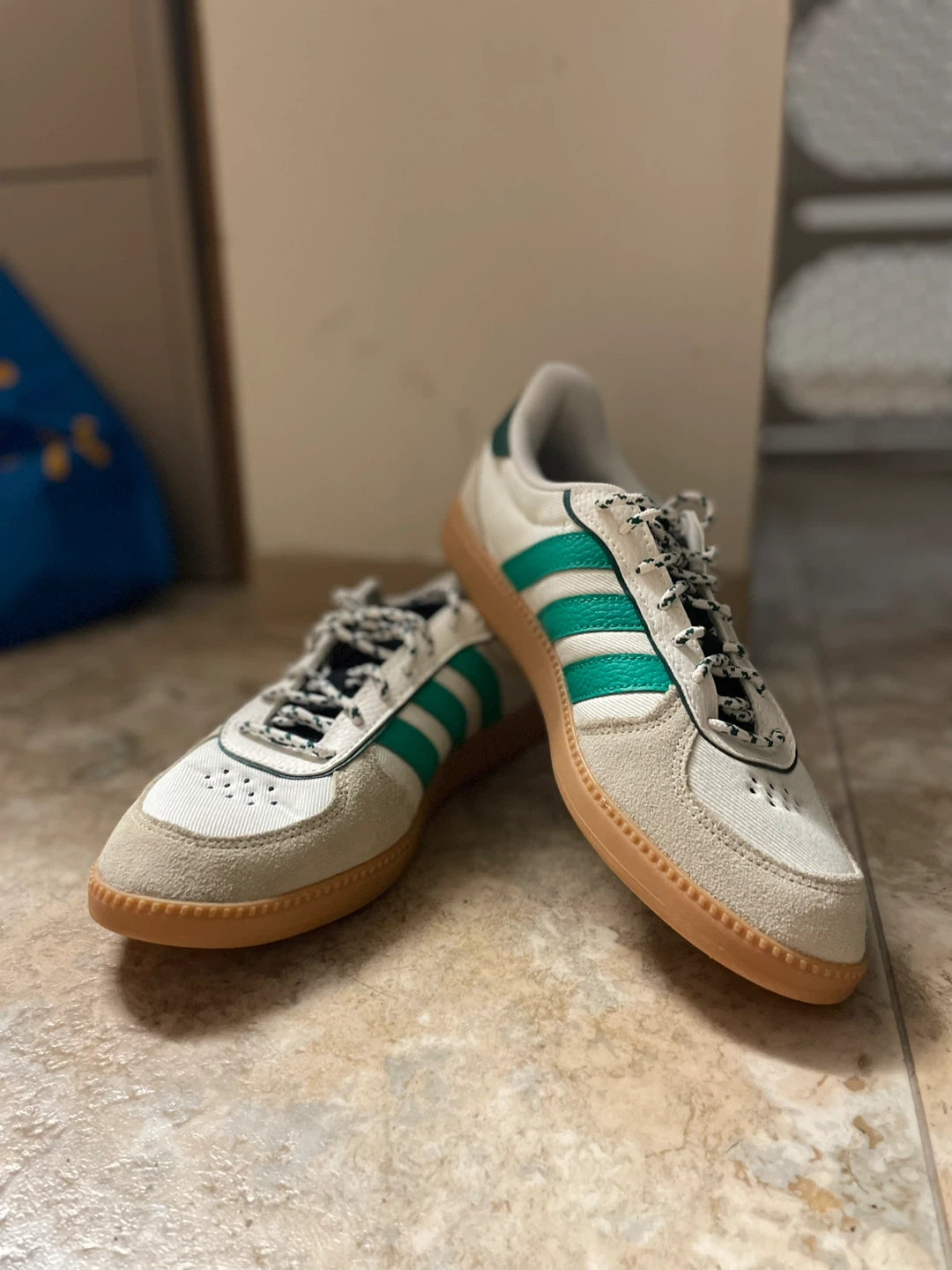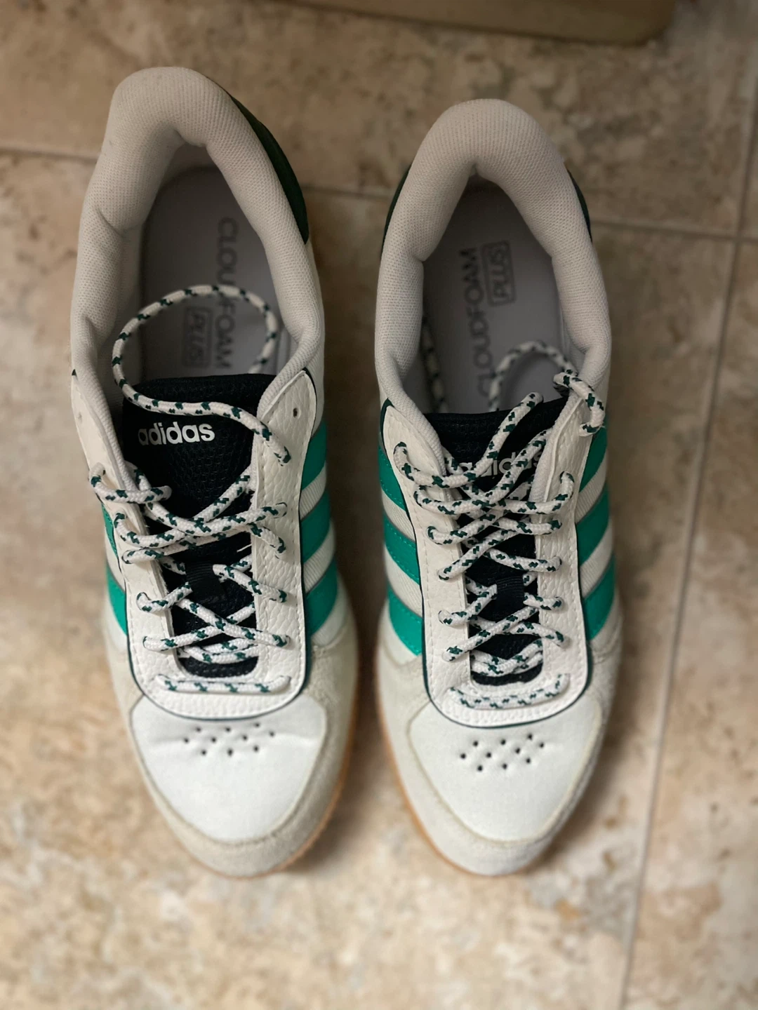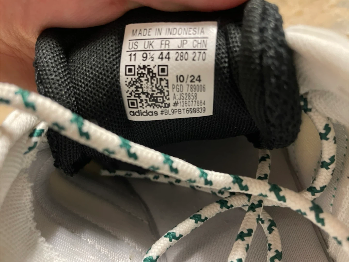 47Selling a pair of Adidas shoes, model A.JS2858, in size 11.5 (US). They feature a white and green colour scheme with unique patterned laces. The soles have a diamond pattern for grip. Perfect for casual wear! Pick up only