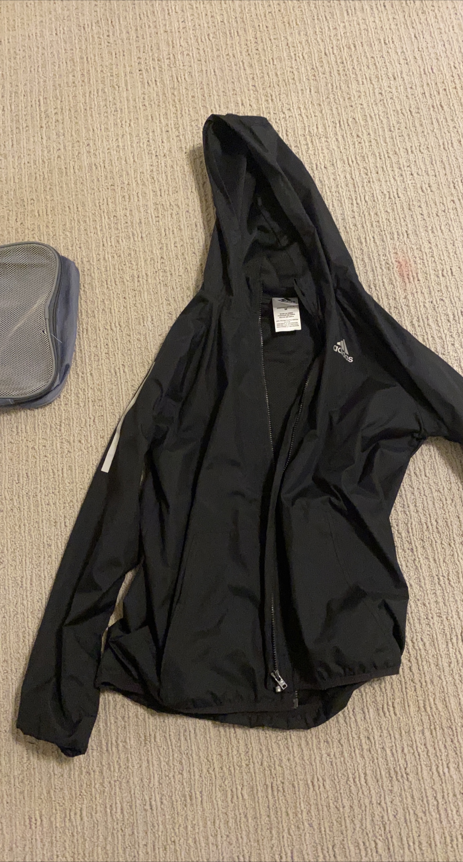 23Selling a black Adidas hooded jacket in size medium. It has the classic Adidas stripes on the sleeves and the logo on the chest. Great for workouts or casual wear!