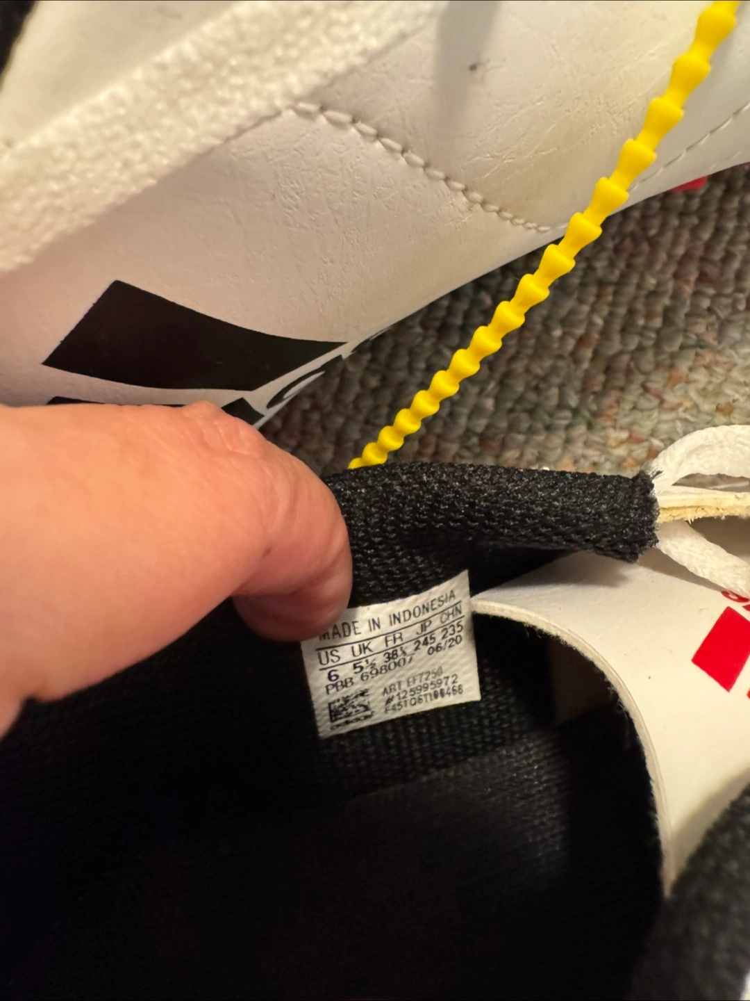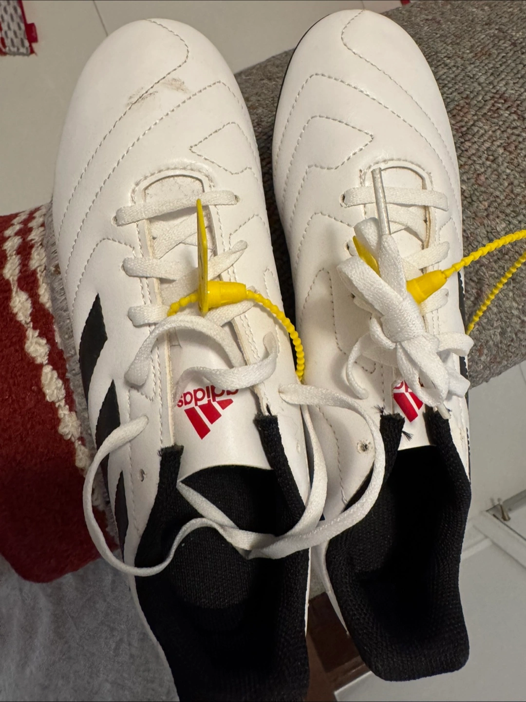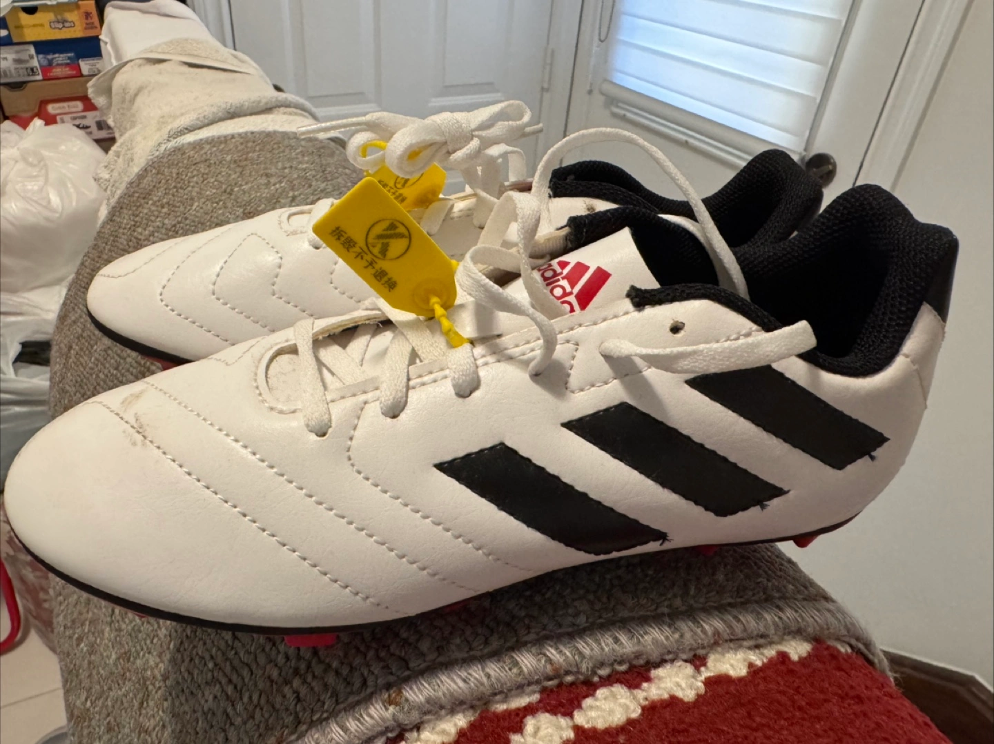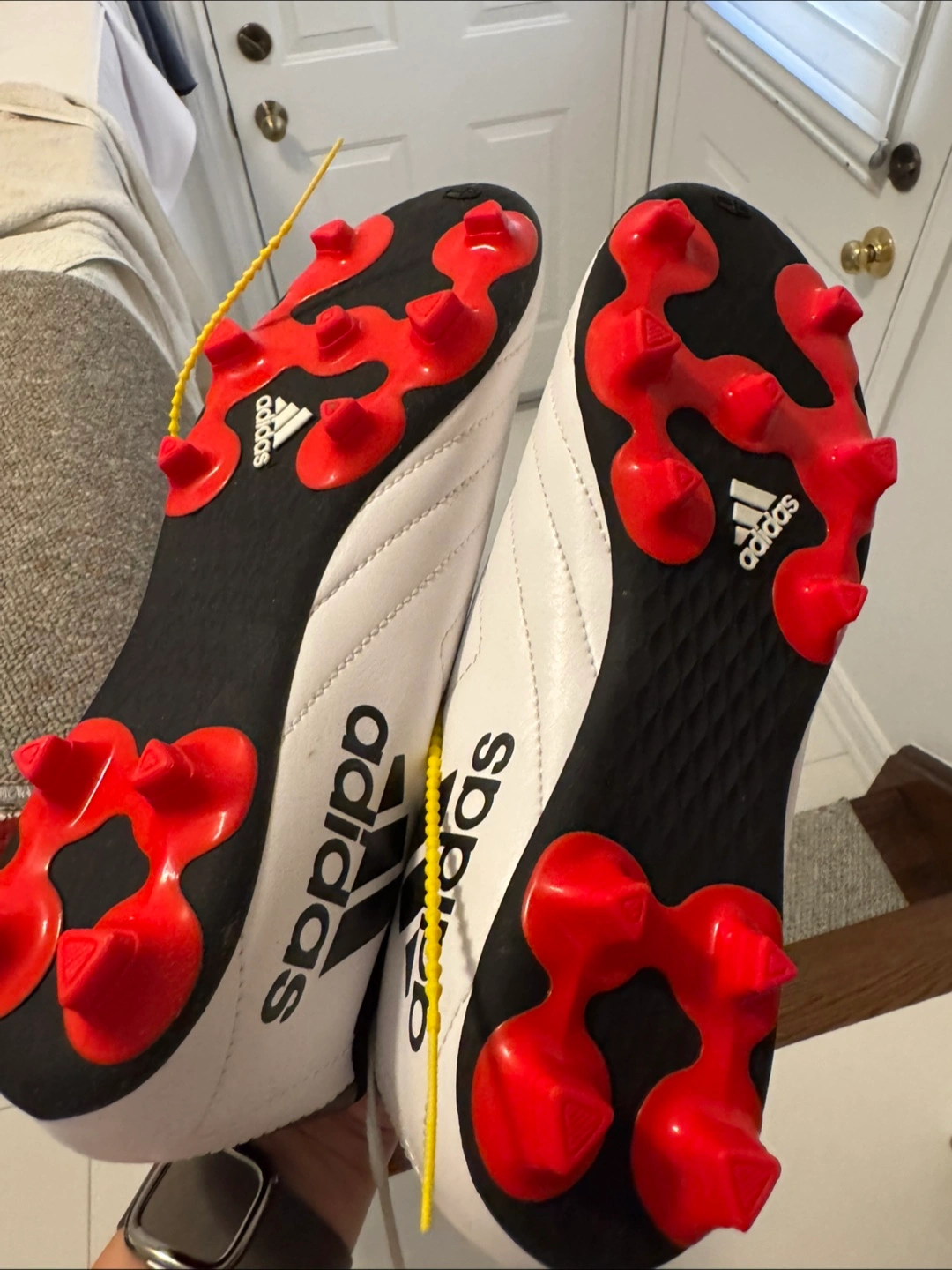 10Selling a pair of Adidas soccer cleats in size 6. They're white with black stripes and red accents on the bottom. Perfect for hitting the field!