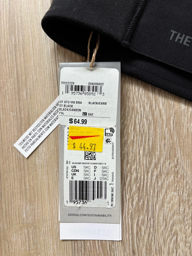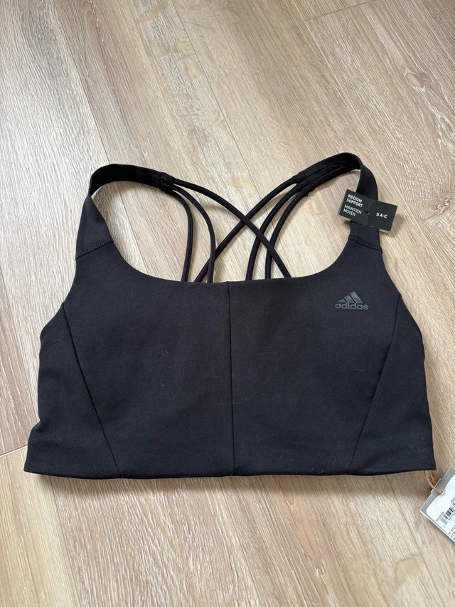 28Sleek Adidas black sports bra with stylish 3 strap back. Really cute! Brand new with tags. Size S cup A-C Medium support The back section is elastic so it has some give.