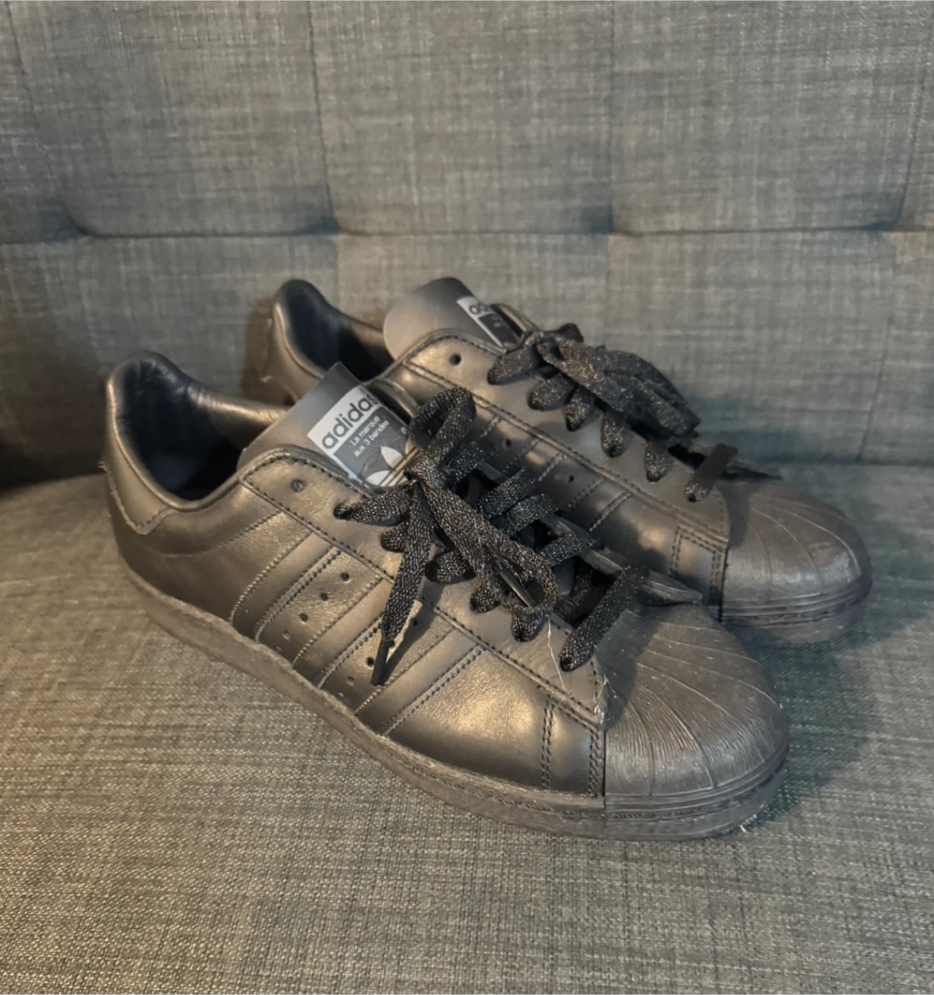 Selling a pair of Adidas Superstar sneakers in black leather! They are in used condition, with some signs of wear. Classic style and comfortable for everyday wear.