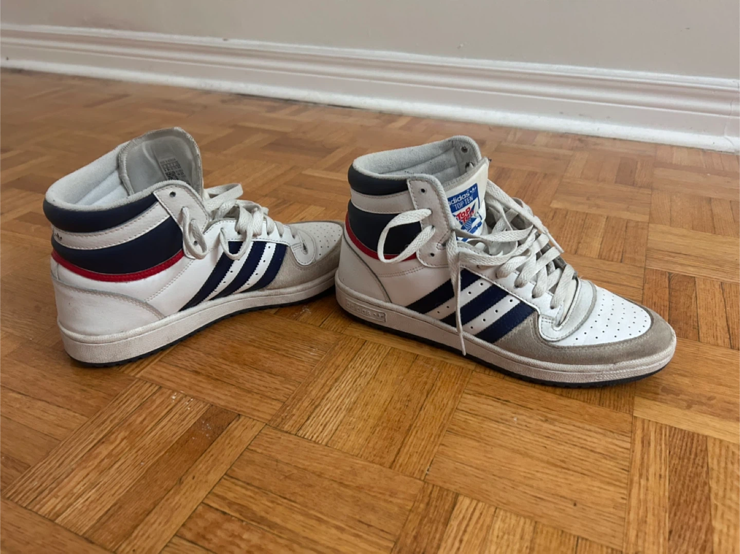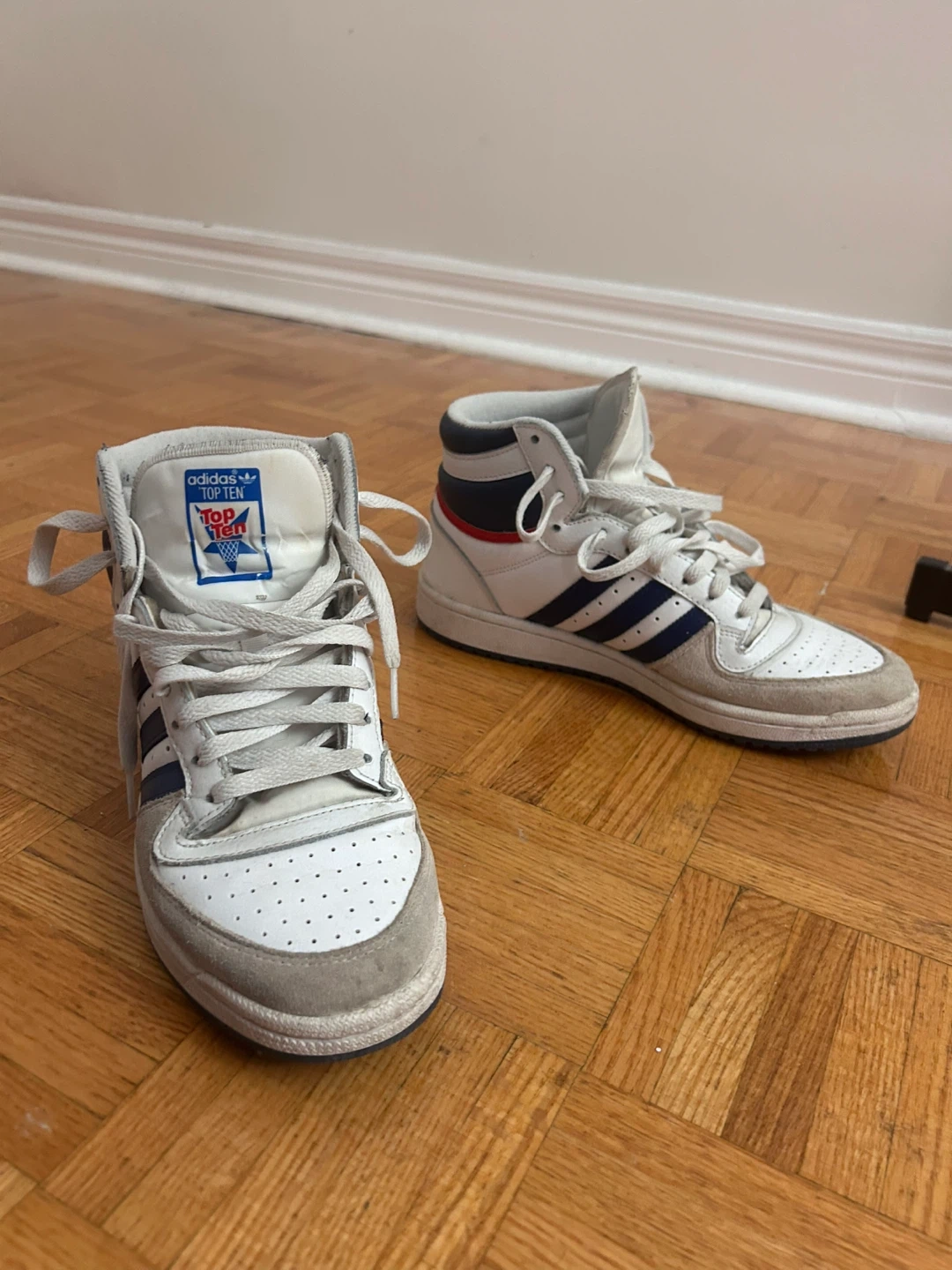 257Selling a pair of Adidas Top Ten high-top sneakers. They're in good condition and have lots of life left! The size is US 9. These classic sneakers feature the iconic Adidas stripes and a comfortable fit.