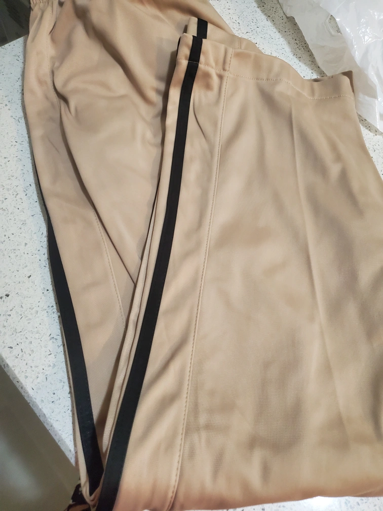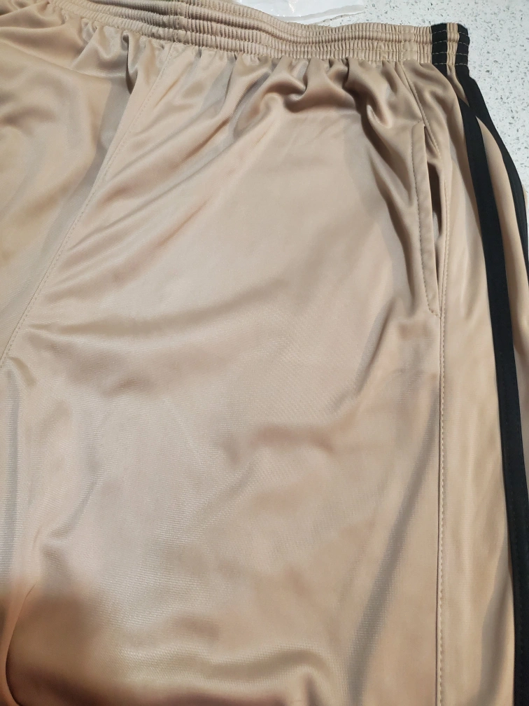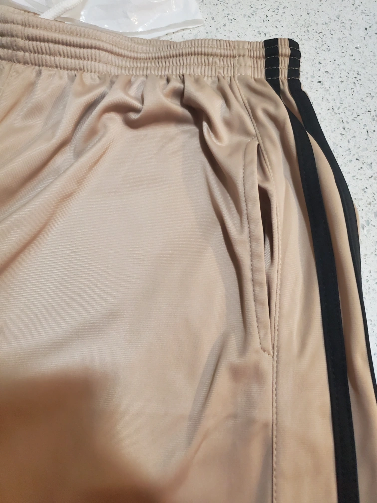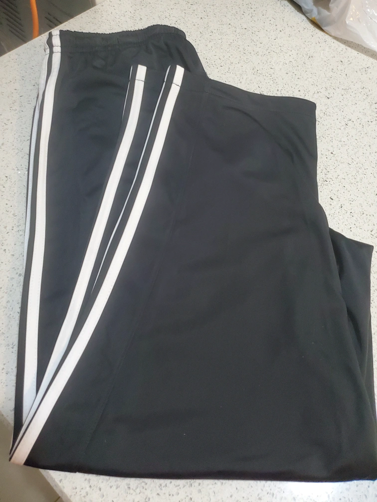 Selling a pair of Adidas track pants. One pair is black with white stripes, and the other is beige with black stripes. Great for workouts or just lounging around!