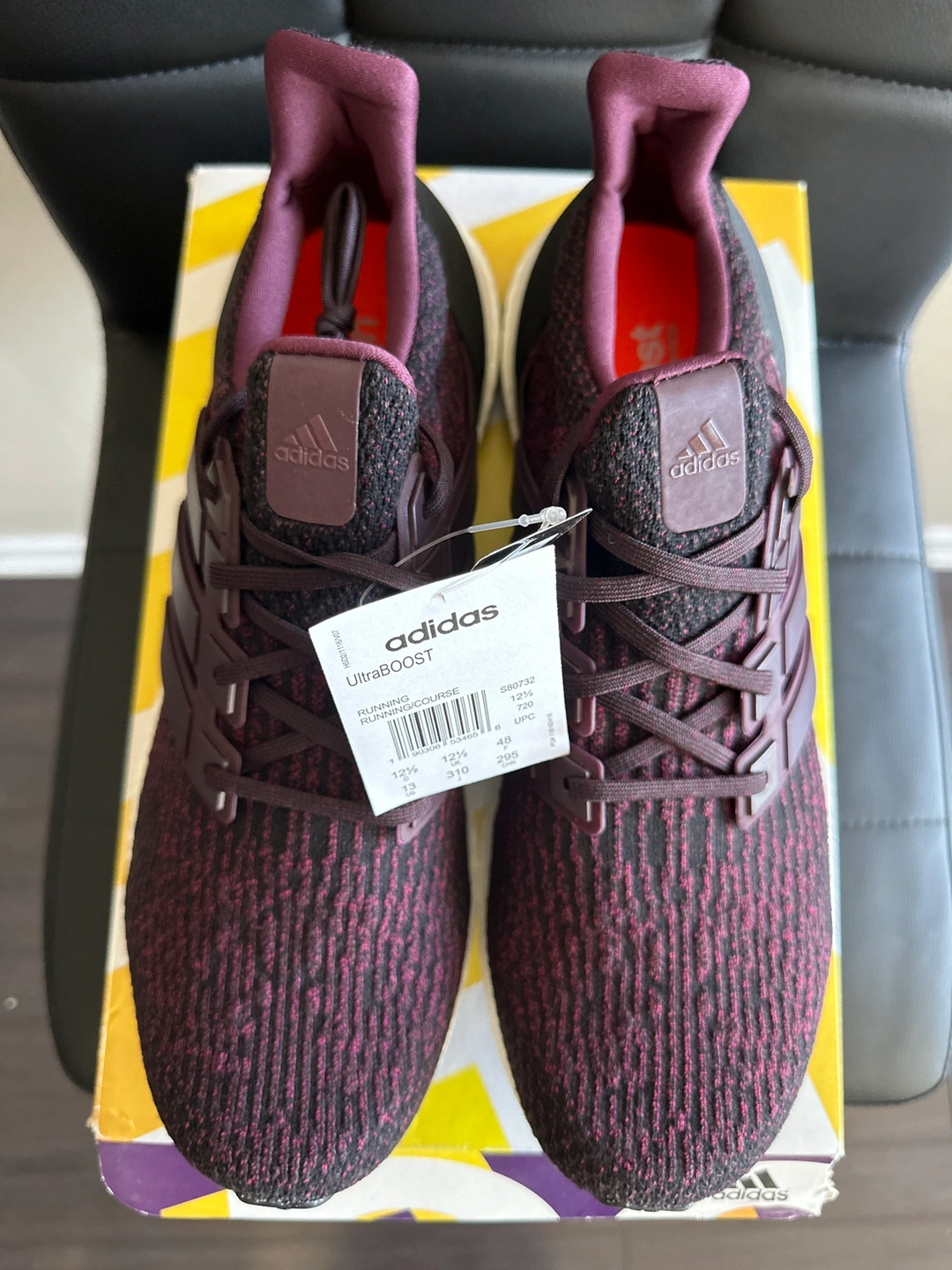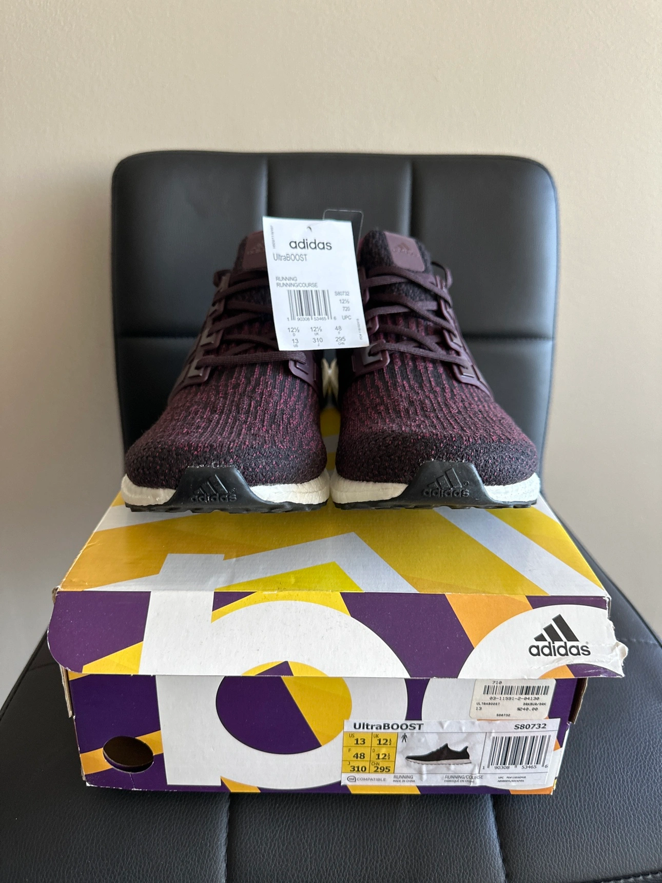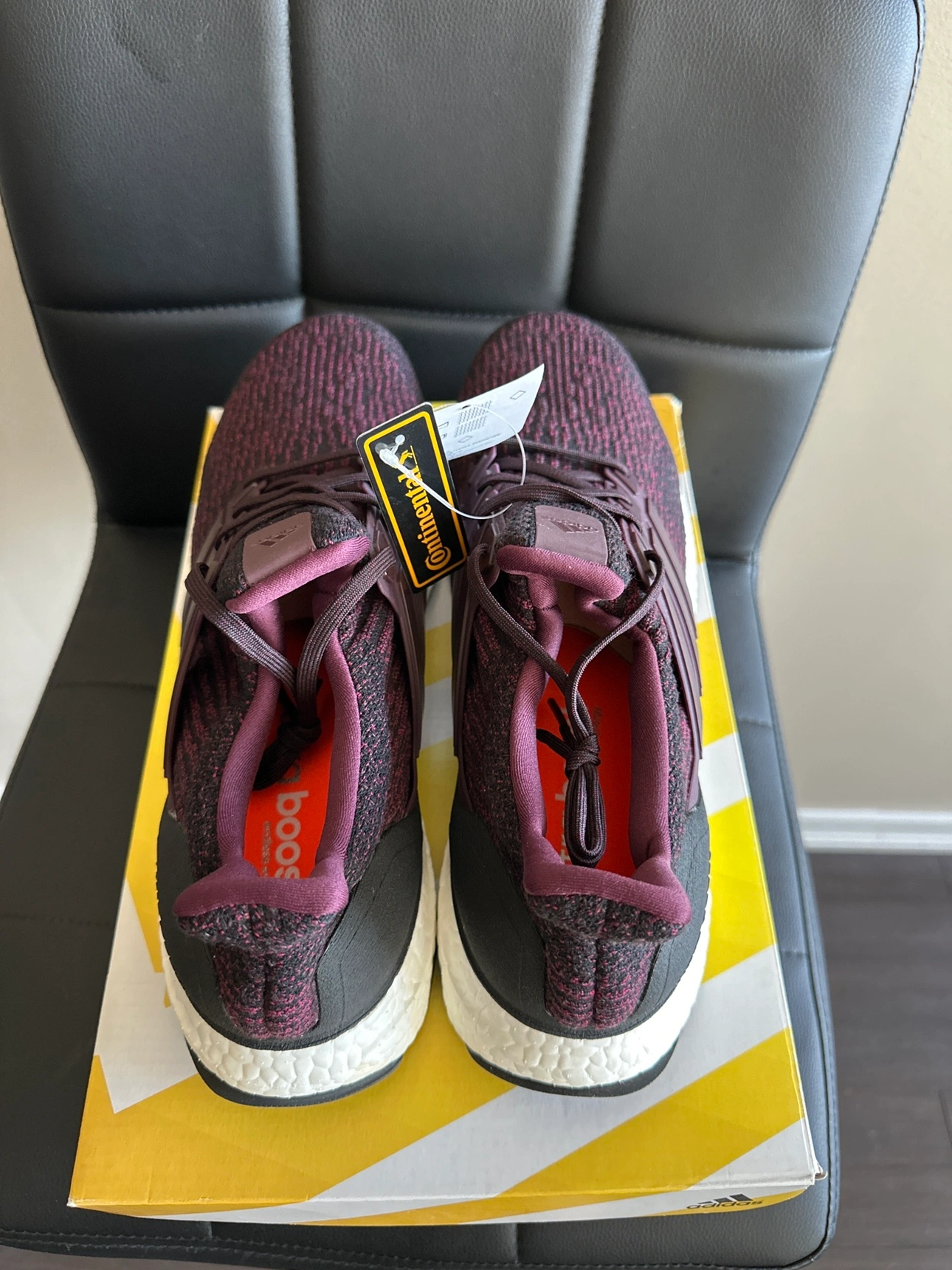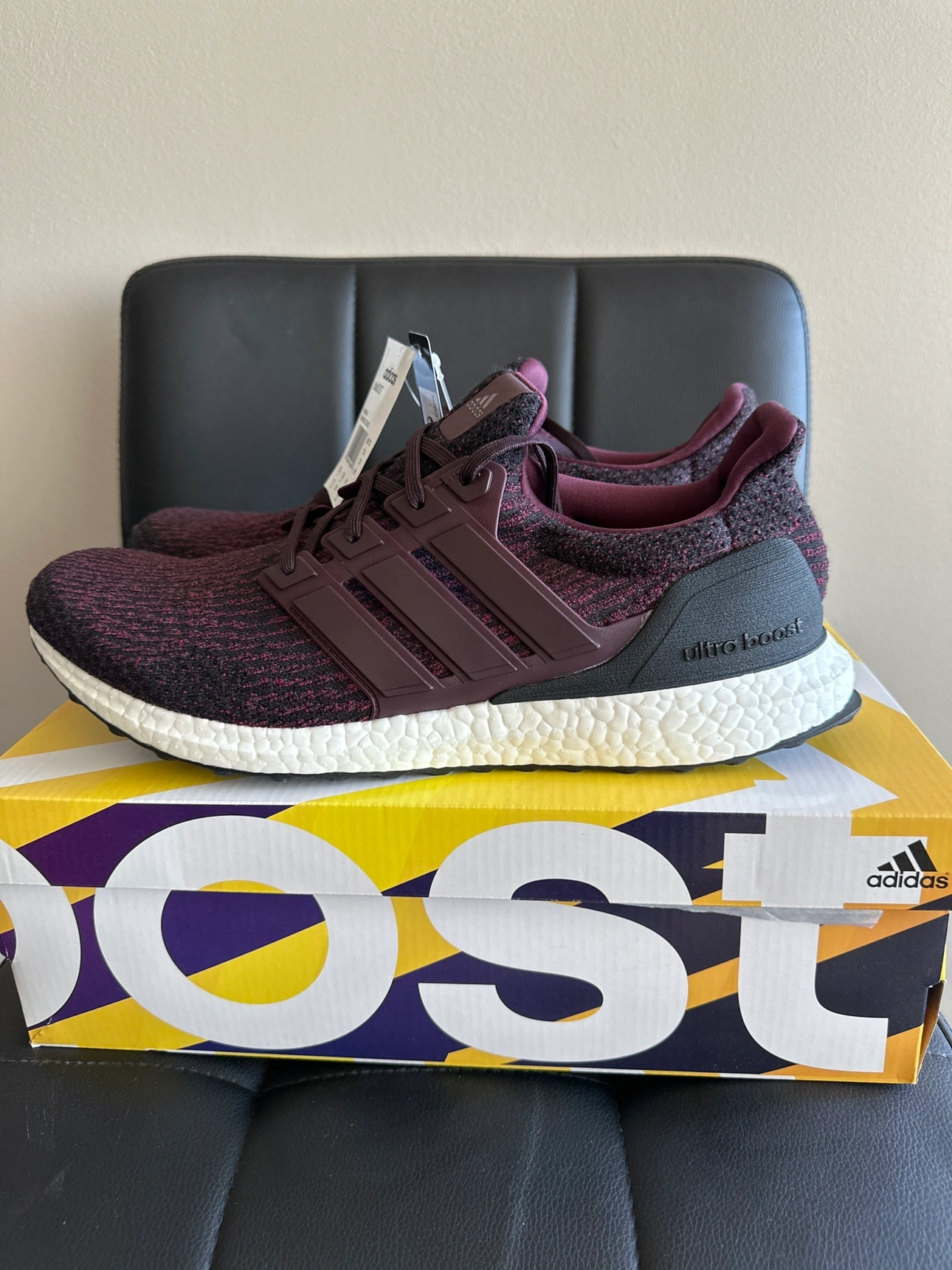 These are Adidas Ultra Boost shoes in Burgundy colour. The shoes are in the original box and the box is in excellent condition. The shoes have never been worn. $100 Meetup at Yorkdale mall
