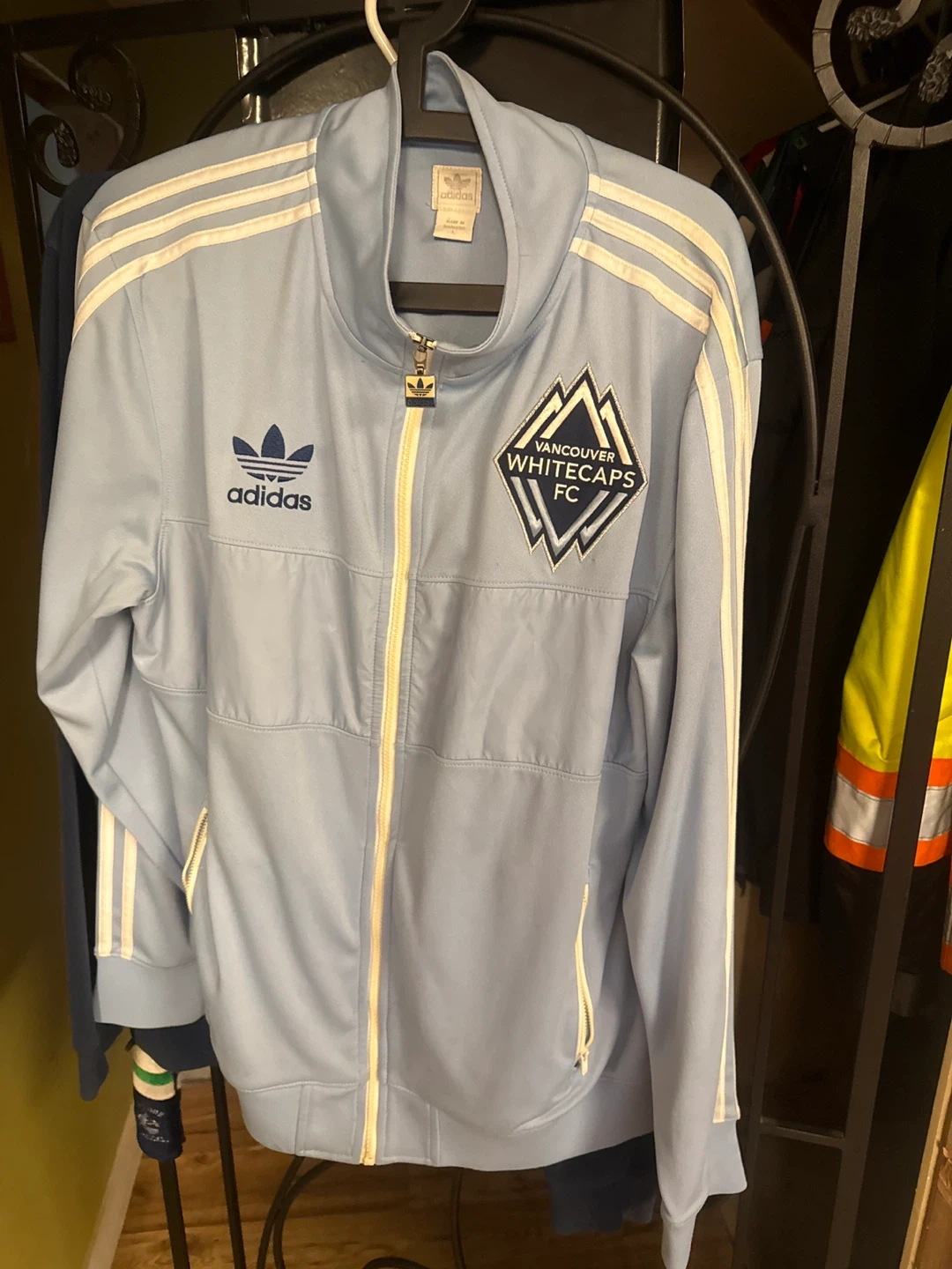 Selling an Adidas Vancouver Whitecaps FC track jacket in light blue. It features the Adidas logo and the Vancouver Whitecaps FC crest. Perfect for any fan!