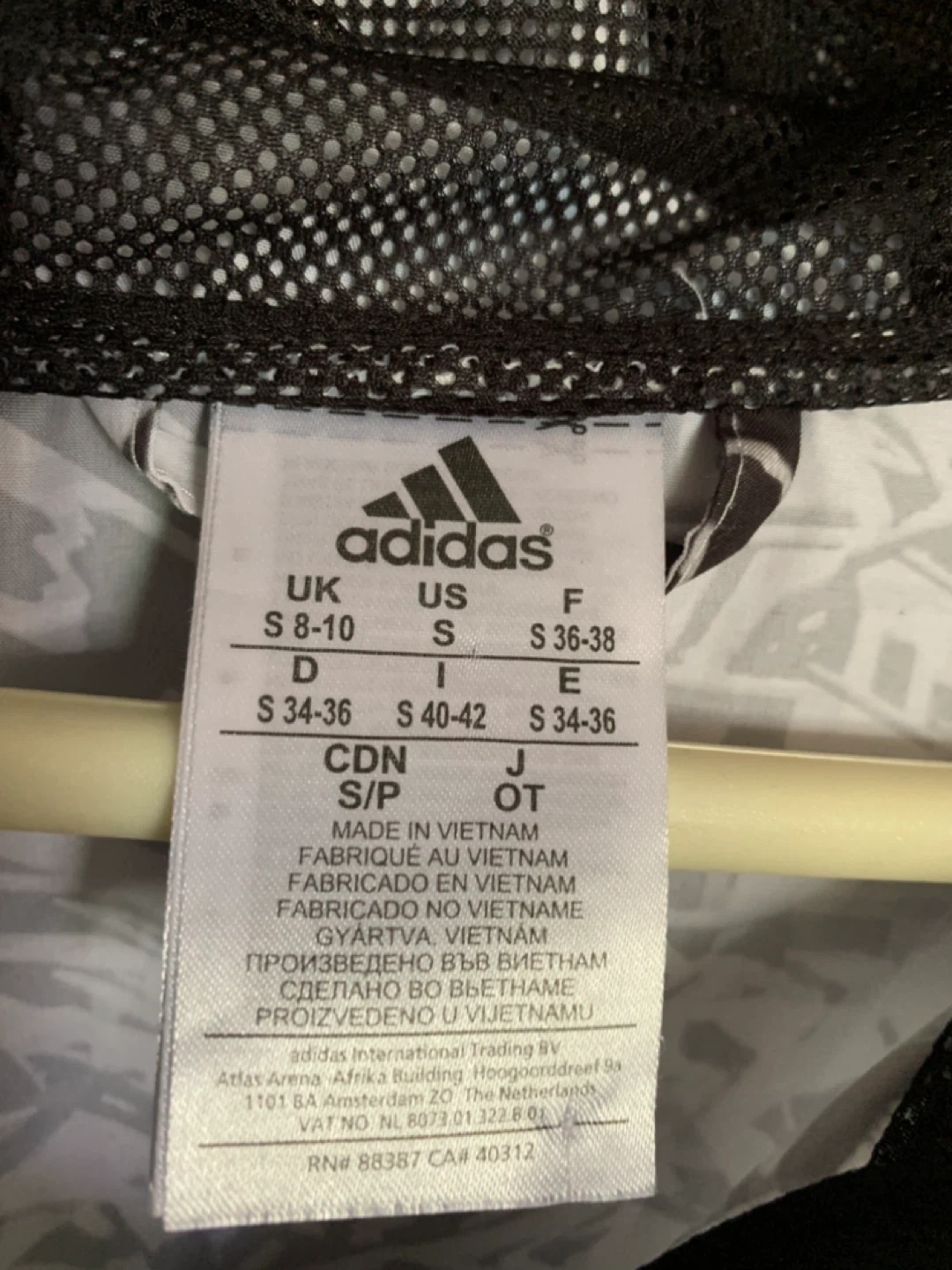 1000+Adidas windbreaker jacket in size S. It has a unique black and white pattern with blue accents. Perfect for outdoor activities or casual wear!