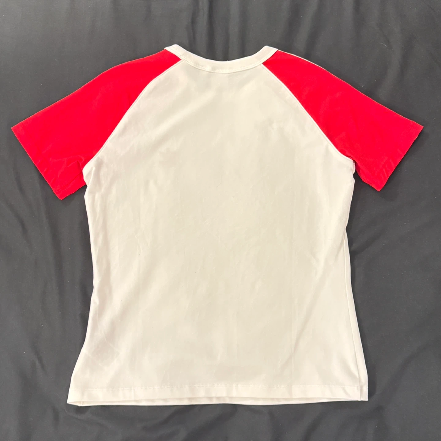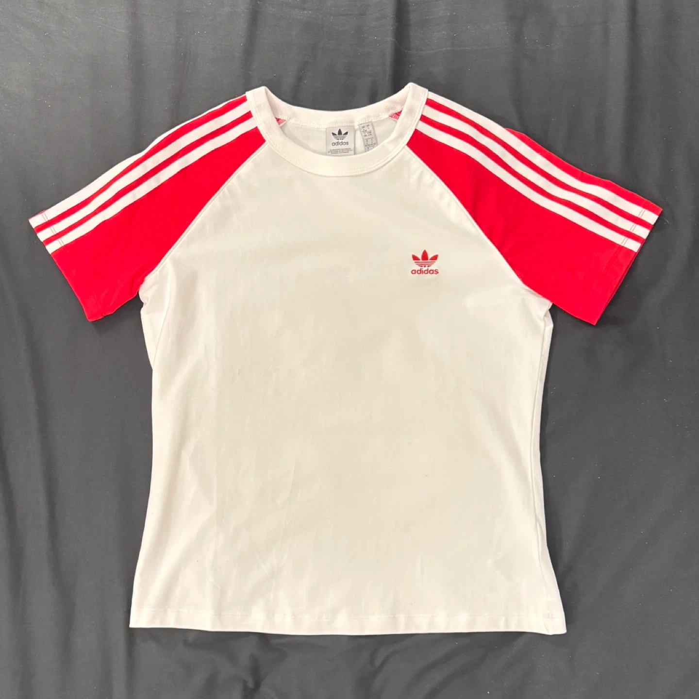 10Selling a cute Adidas women's t-shirt! It's in great condition and features a classic red and white colour scheme with the iconic three stripes on the sleeves and the Adidas logo on the chest