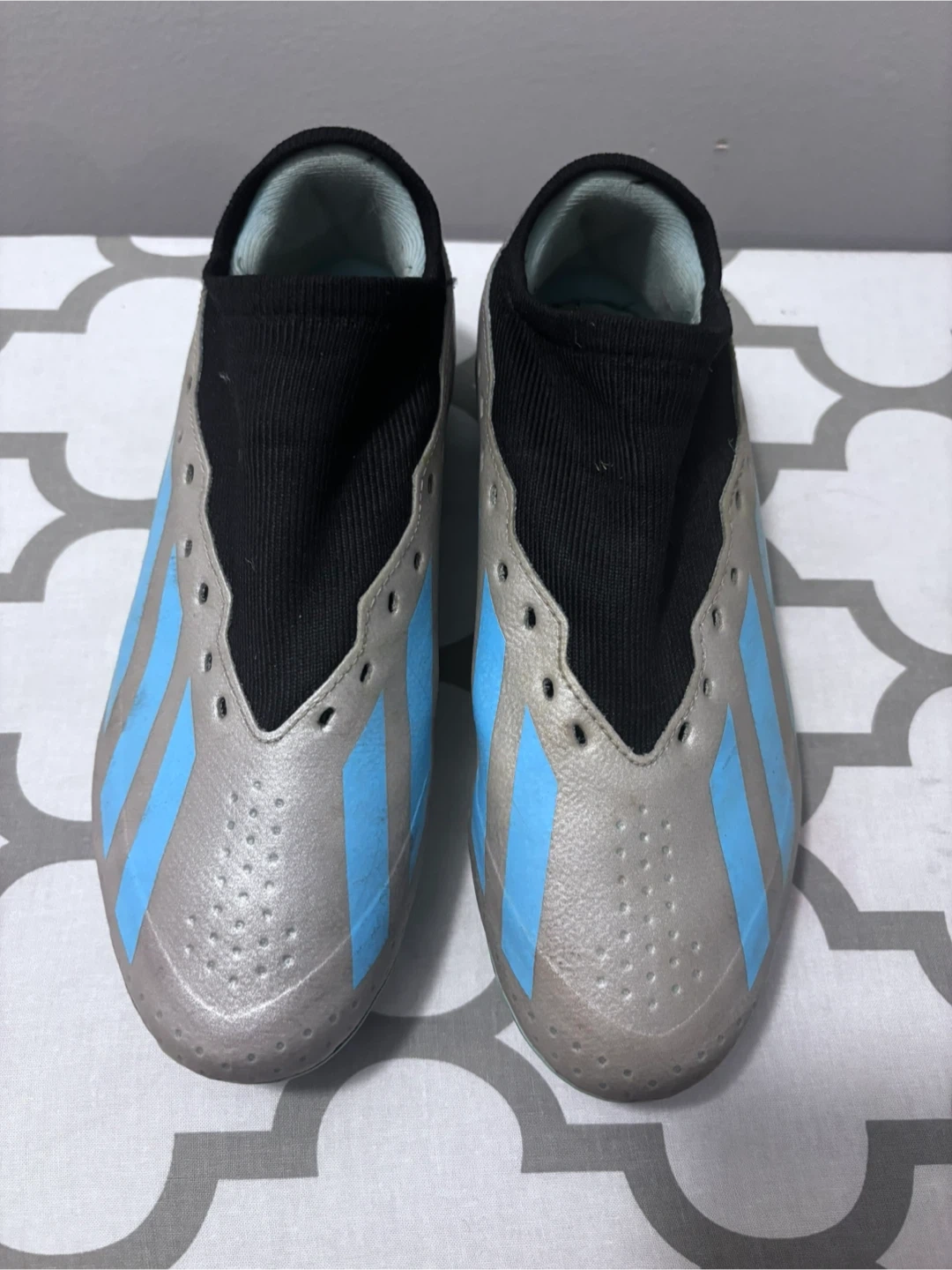 10Selling a pair of Adidas X Speedportal Messi turf shoes. They feature a sleek silver and blue design with a black sock-like ankle cuff. Perfect for playing on turf!