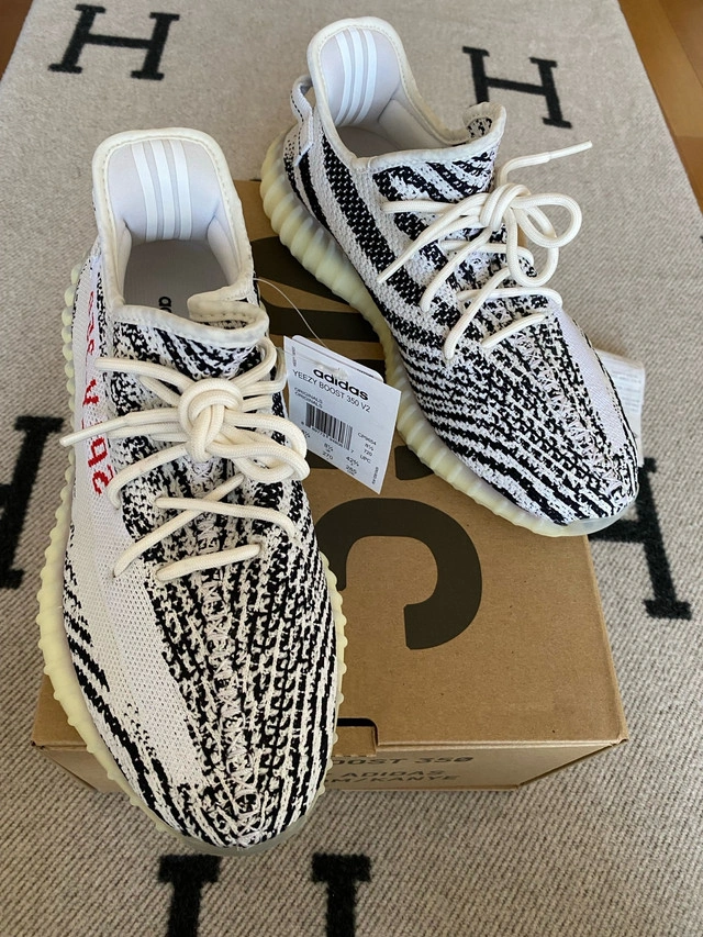 Selling a pair of Adidas Yeezy Boost 350 V2 Zebra in US size 9. These stylish sneakers feature the iconic Zebra pattern and are in brand new unworn condition, as you can see from the pictures. They come with the original box, tags and receipts. * Brand: Adidas * Model: Yeezy Boost 350 V2 * Colour: Zebra * Size: US 9 Based on recent sales, I'm asking $400, which reflects their excellent condition. If the ad's up, they're still available, so no need to ask!