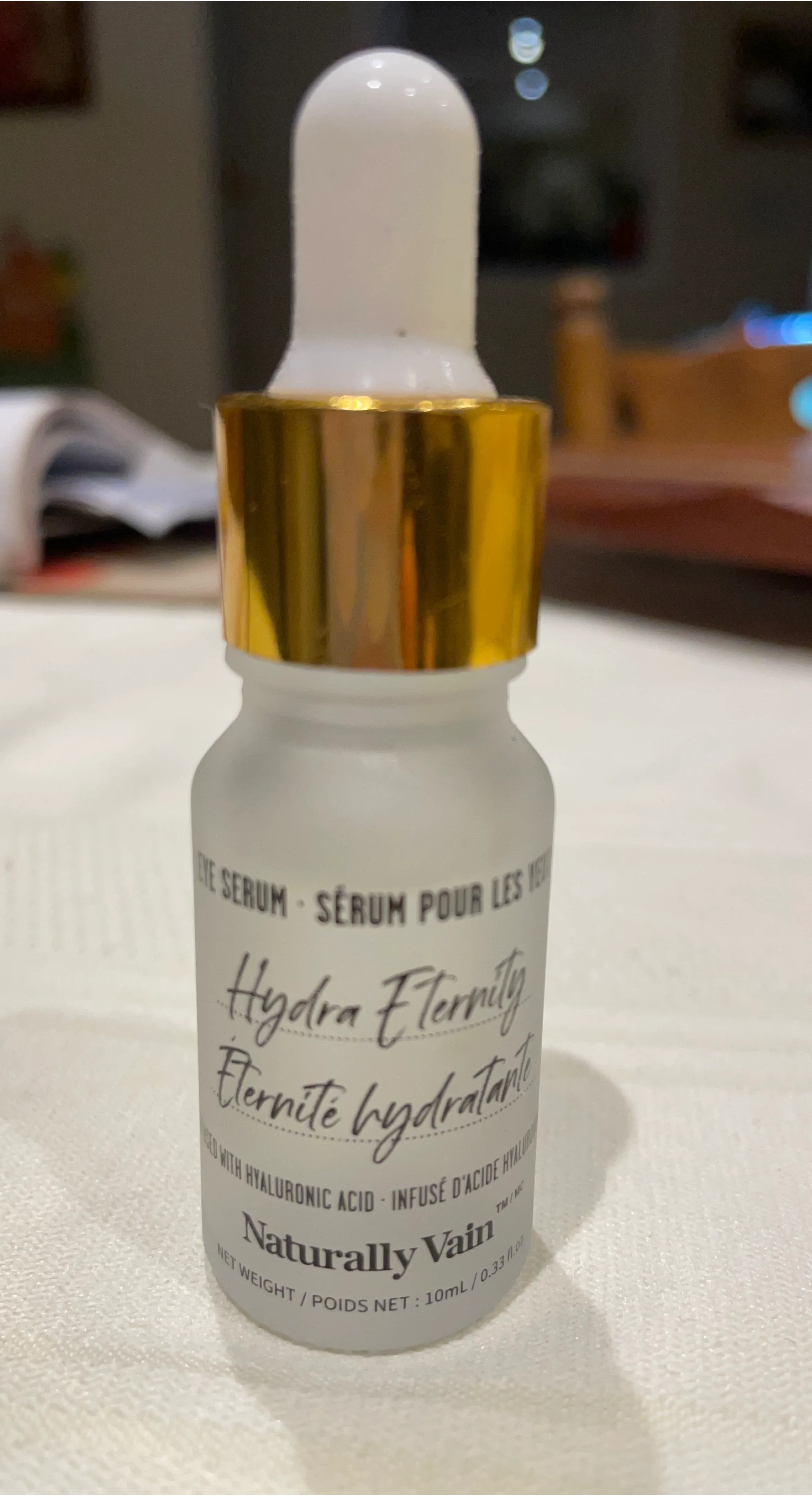 Naturally Vain Hydra Eternity Eye Serum. Infused with hyaluronic acid. 10mL / 0.33 fl.oz. This eye serum is designed for hydration.