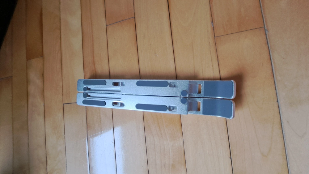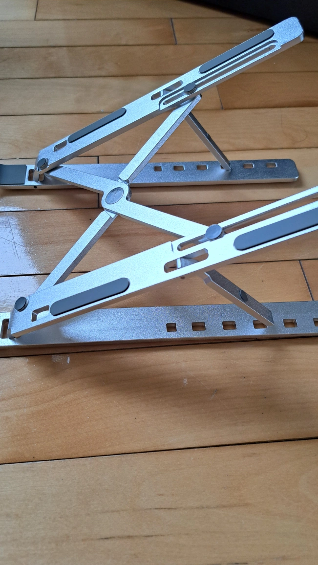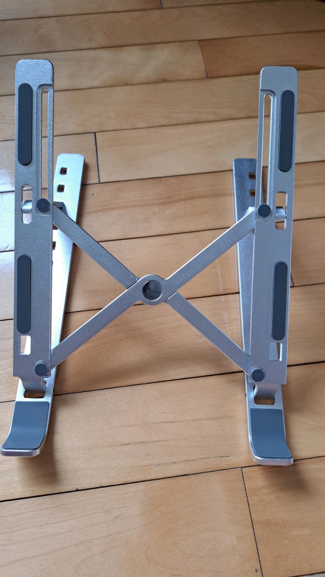 Selling an adjustable laptop stand. It's made of aluminum and is a sleek silver colour. It folds up for easy storage and portability. Great for working from home or on the go!