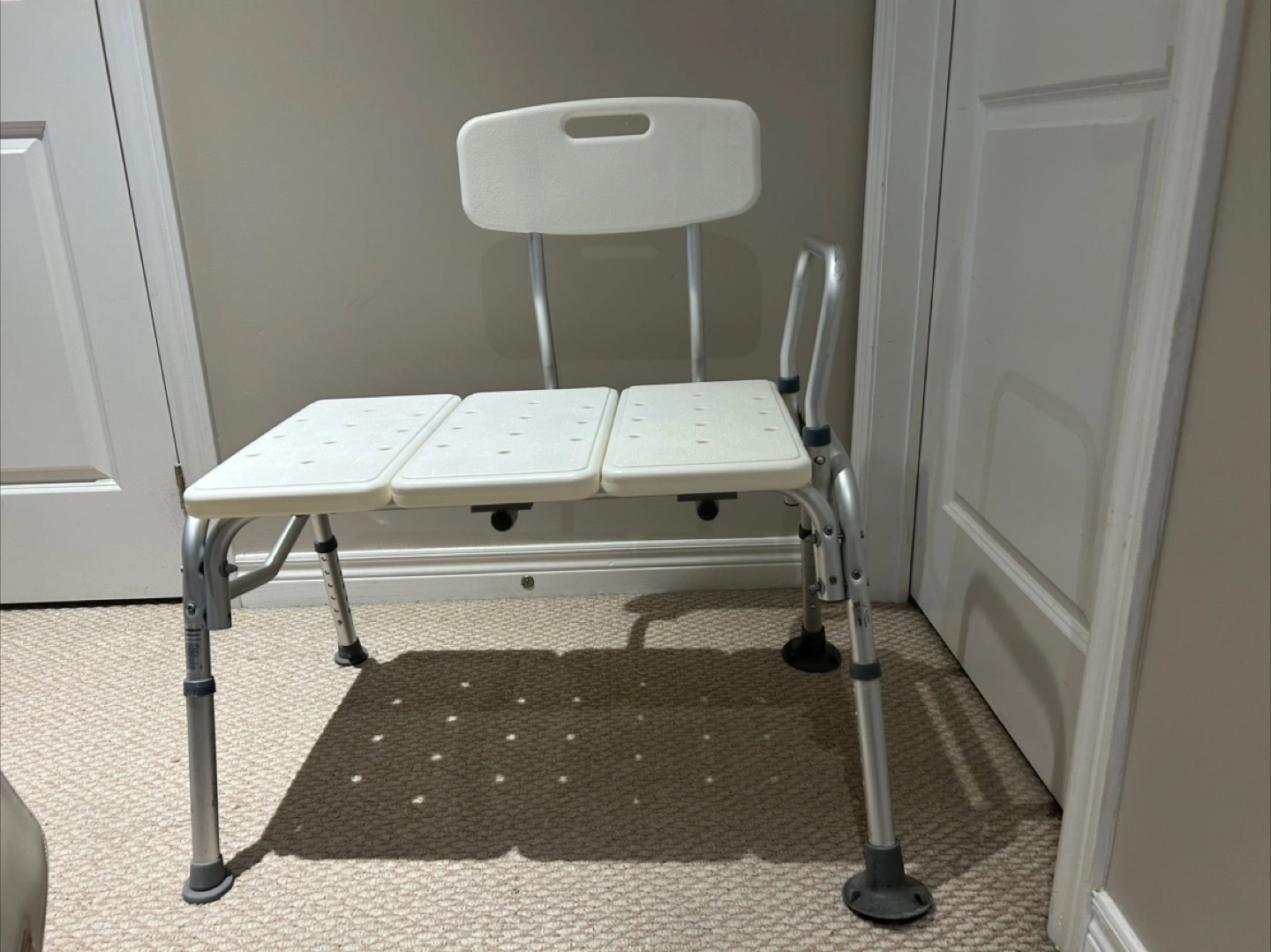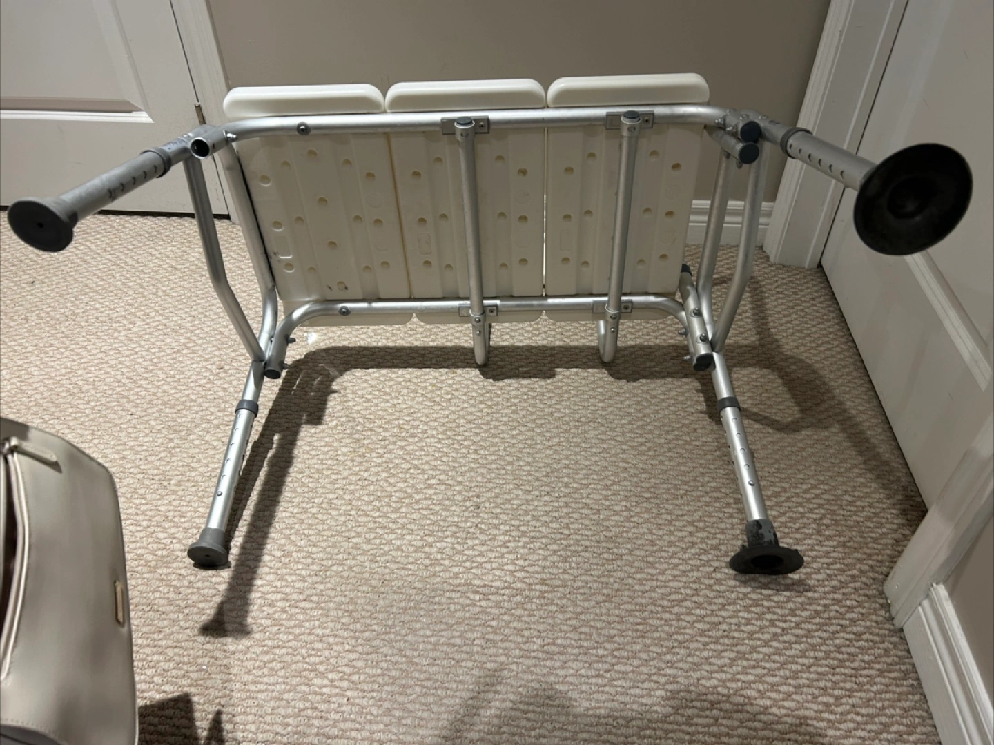 Selling a sturdy bath/shower chair with a backrest. It's adjustable to different heights, making it suitable for various needs. The chair is in great condition and provides a safe and comfortable bathing experience.