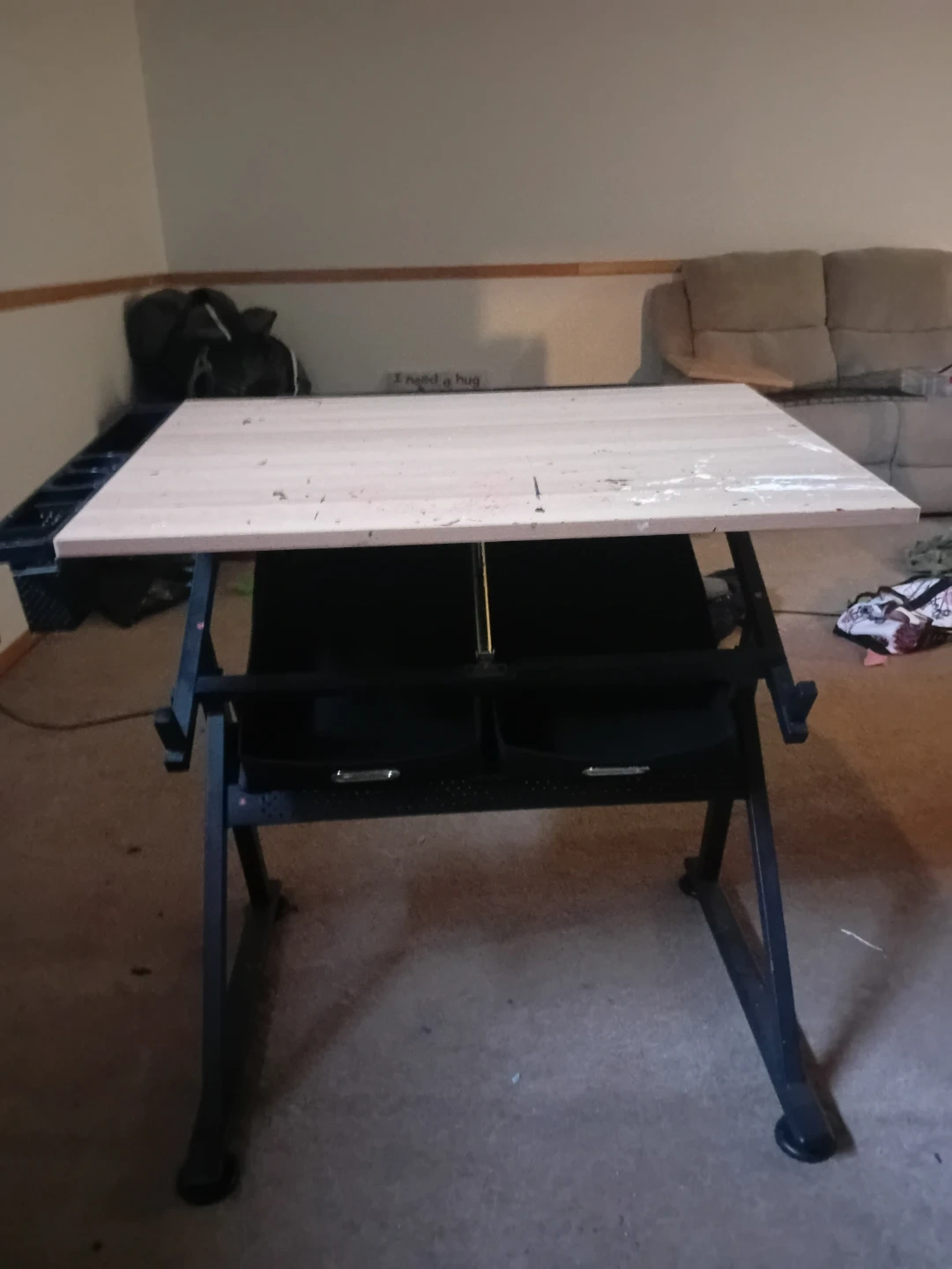 18Selling an adjustable drafting or drawing table. It features a black metal frame and a light-colored wooden top. There are some signs of use on the table top, but it's still in good working condition! My mom's ex messed up while building it, but it still works perfectly!