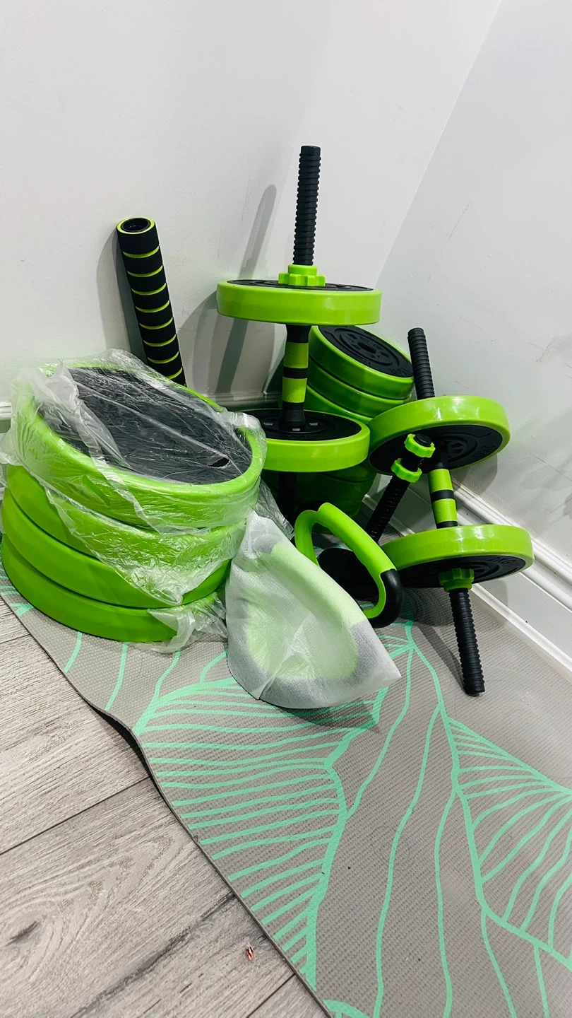 65Get fit with this adjustable dumbbell and barbell set! It's in great shape and ready for your home workouts. Key features: - Versatile: Can be used as dumbbells or a barbell - Adjustable weight: Includes various weight plates (1.5kg, 1.25kg, 2kg, and 5kg) - Comfortable grip: Foam-covered handles for a non-slip, sweat-absorbing, and pain-reducing workout - Reliable materials: Durable plastic cover to protect your floors