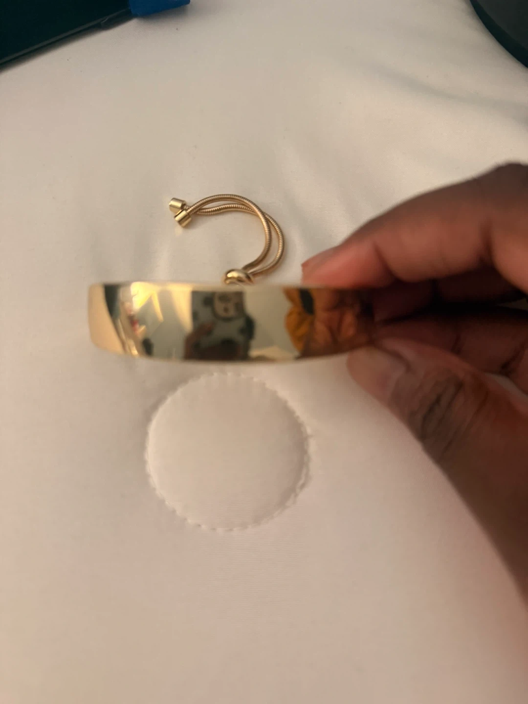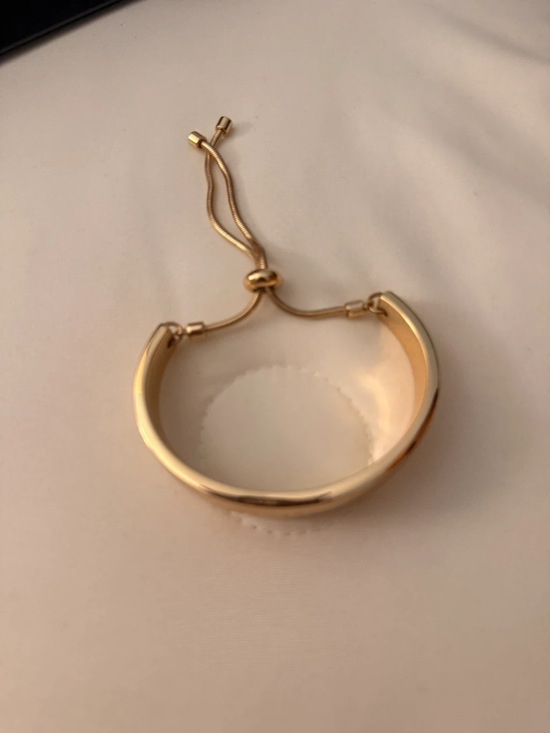 65Selling a stylish gold bangle bracelet! It's in great condition and features an adjustable design for the perfect fit. The sleek and simple design makes it a versatile accessory for any outfit. Feel free to message me with any questions!