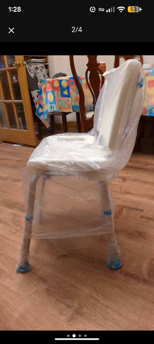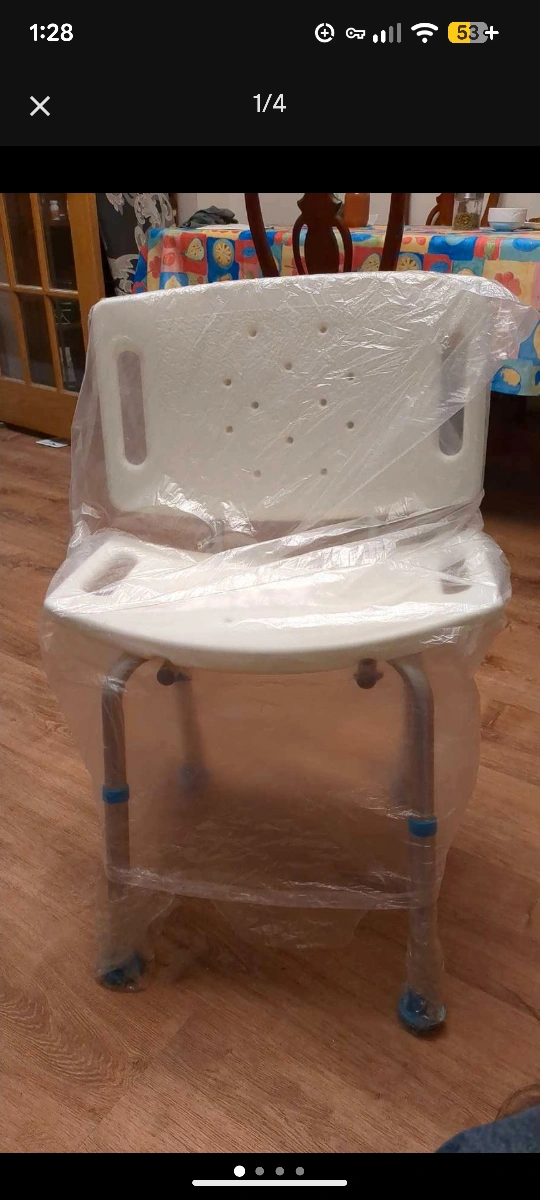 15Selling a bath or shower chair with adjustable height legs. It is white with a back and has a handle on the seat. The chair is in new condition and still in its original packaging.