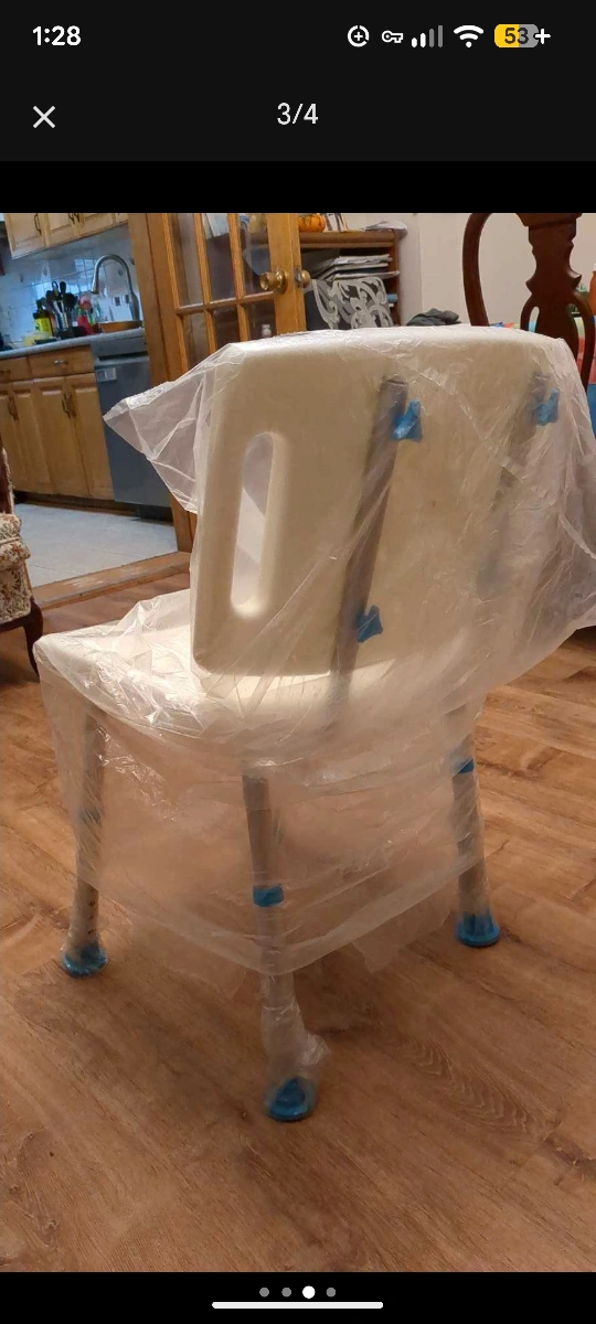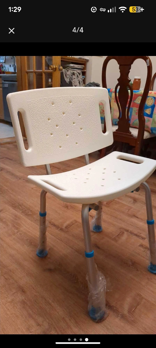 Selling a bath or shower chair with adjustable height legs. It is white with a back and has a handle on the seat. The chair is in new condition and still in its original packaging.