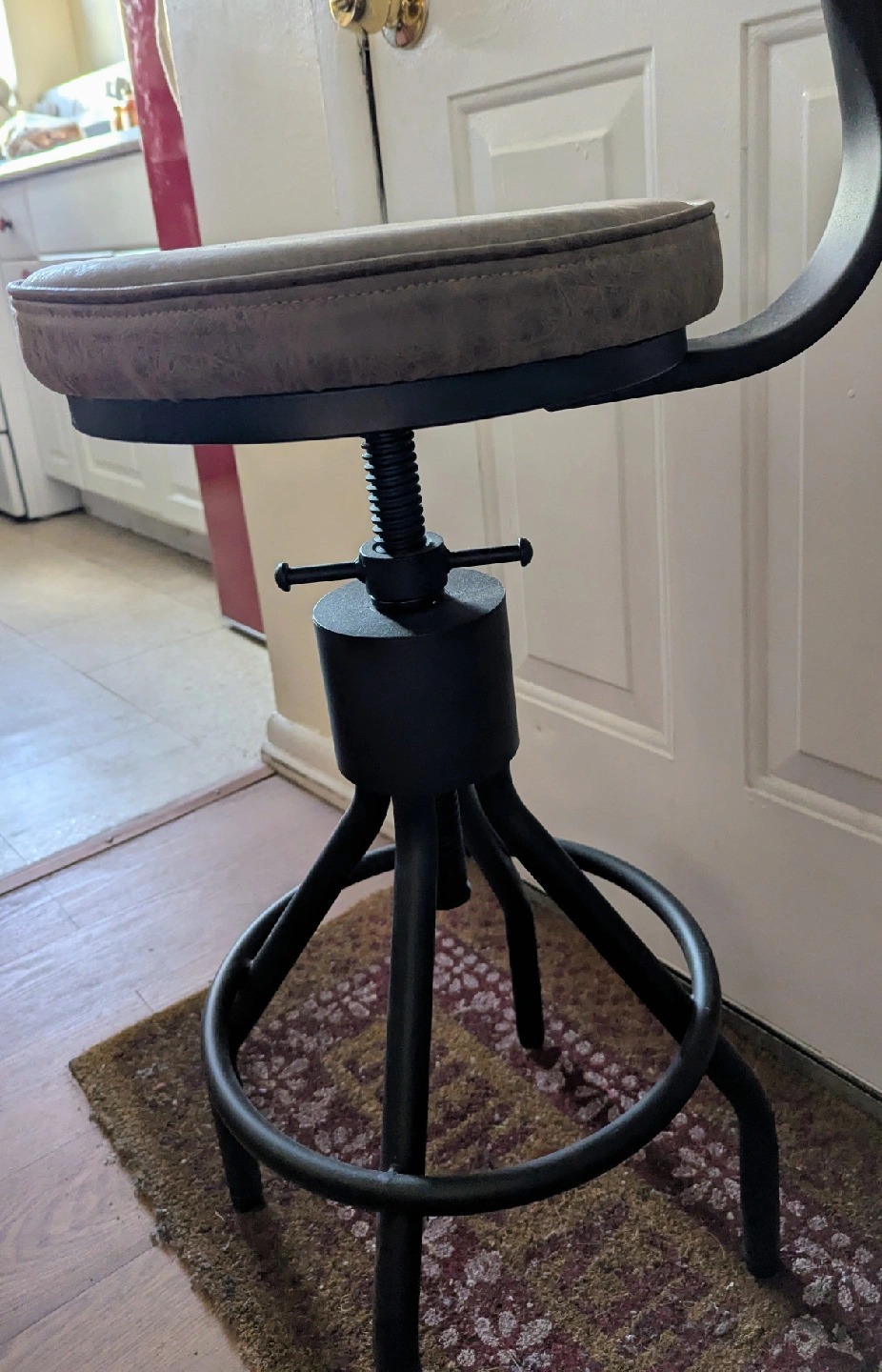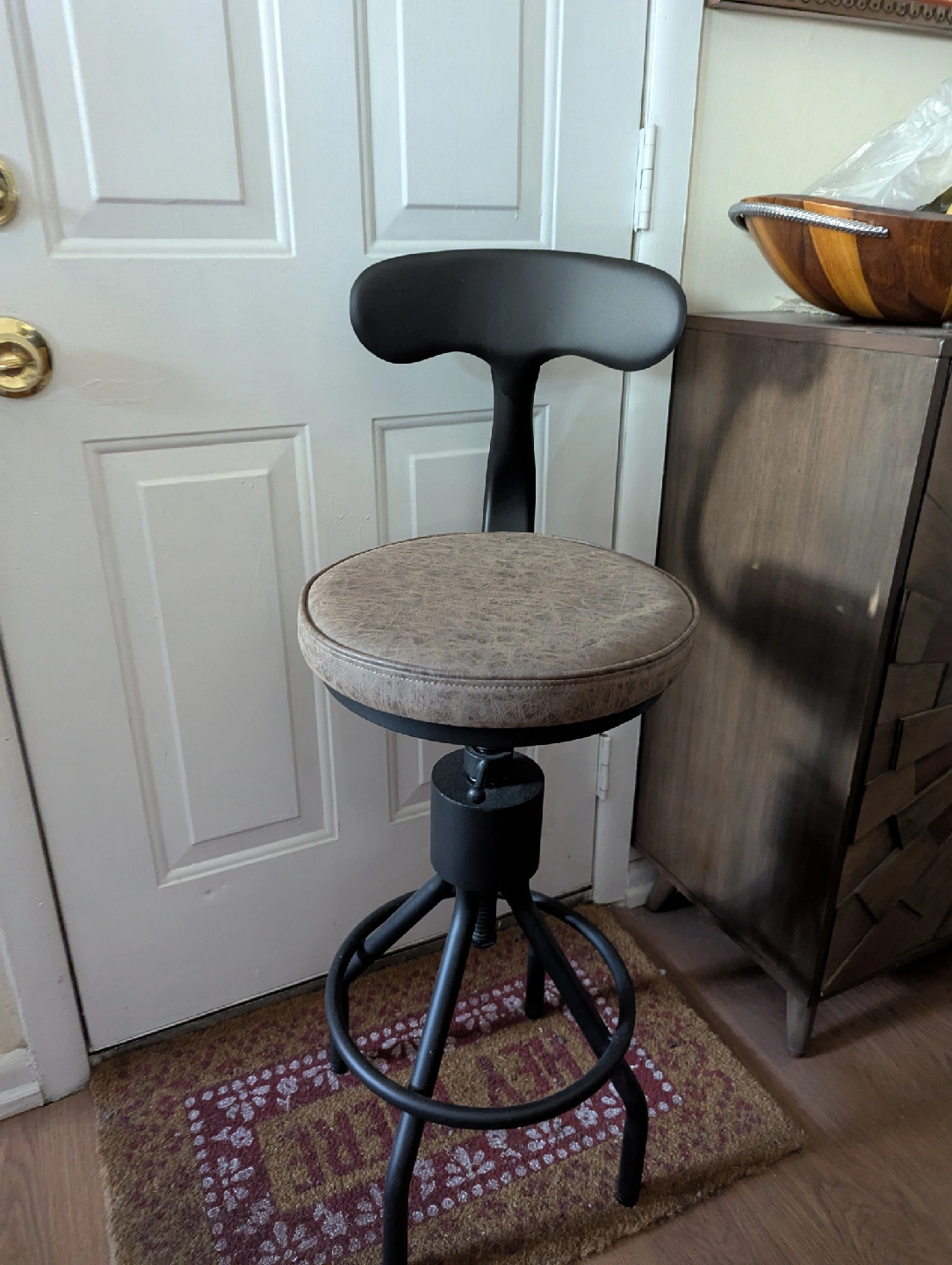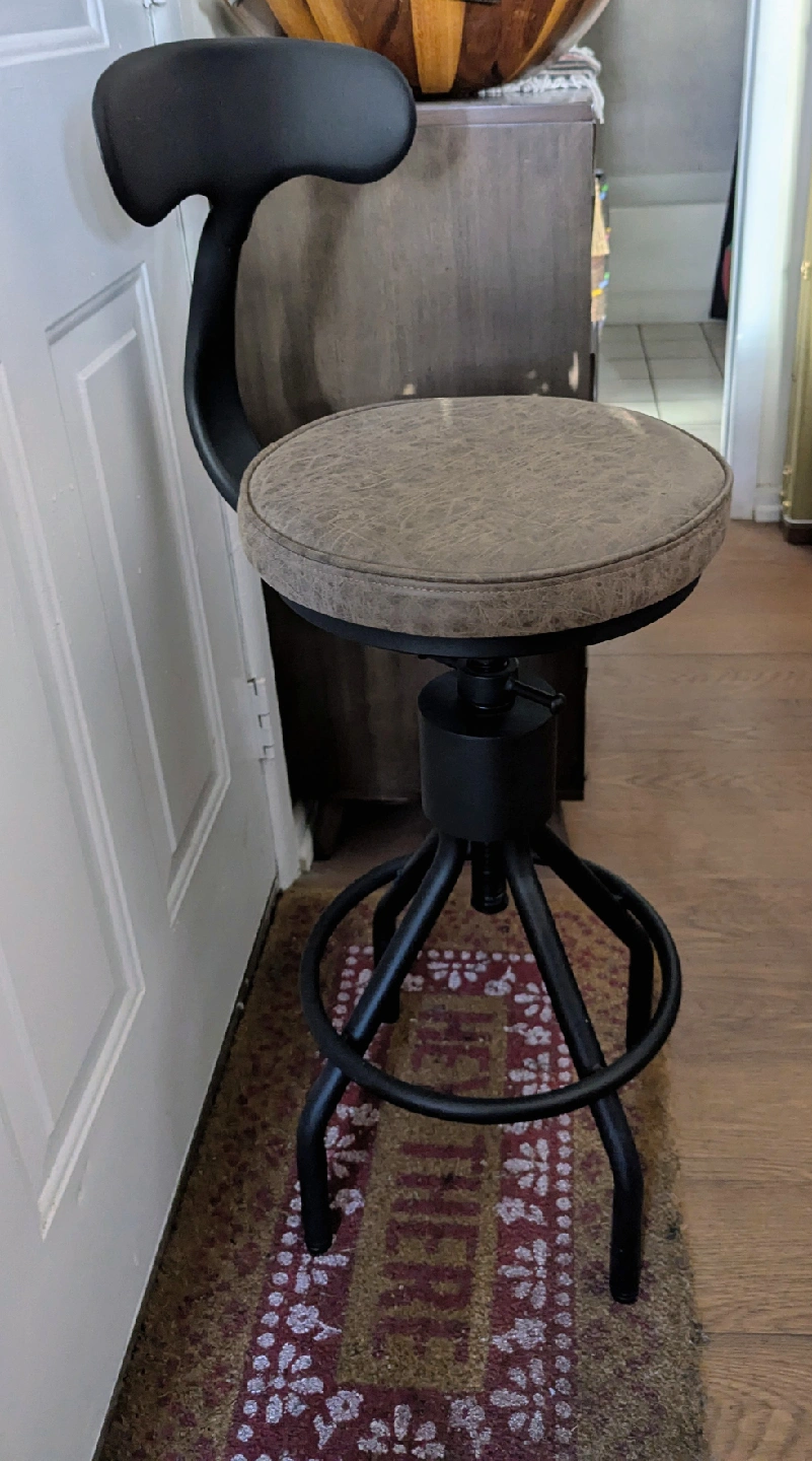 Here's a swivel bar stool with an adjustable height feature! The seat is padded and has a leather-like finish in a neutral color. The base is black metal. It would be great for a kitchen counter or bar area. In excellent condition. 1 for $35 or 2 for $50. Cash and pick up only.