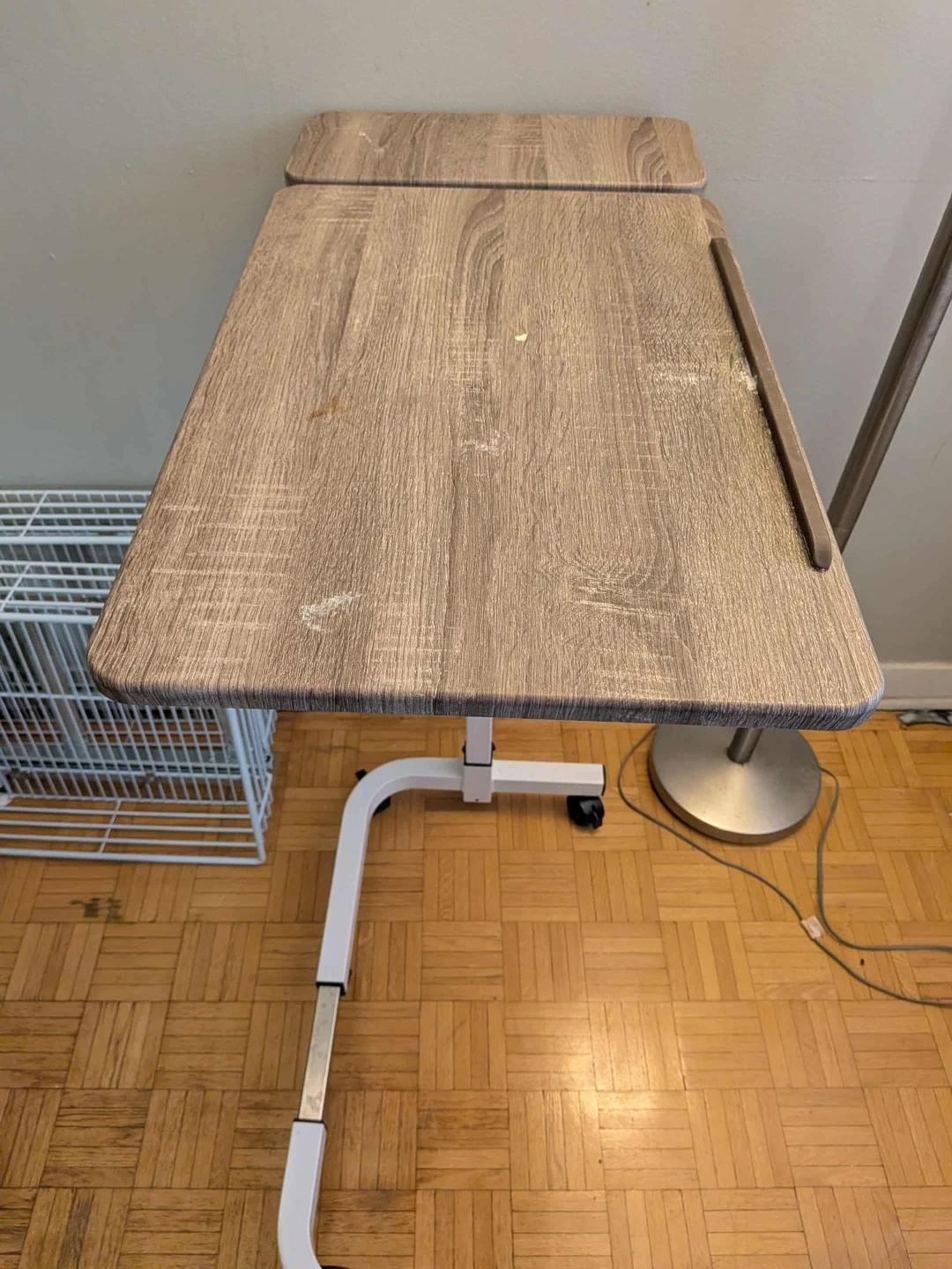 77Selling an adjustable overbed table! It has a light wood-look top and a white base. It's perfect for using your laptop in bed or for eating meals comfortably. It's in good condition and ready for a new home