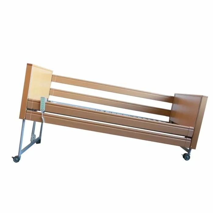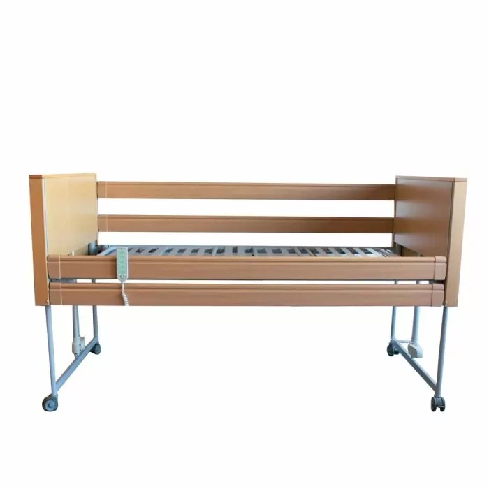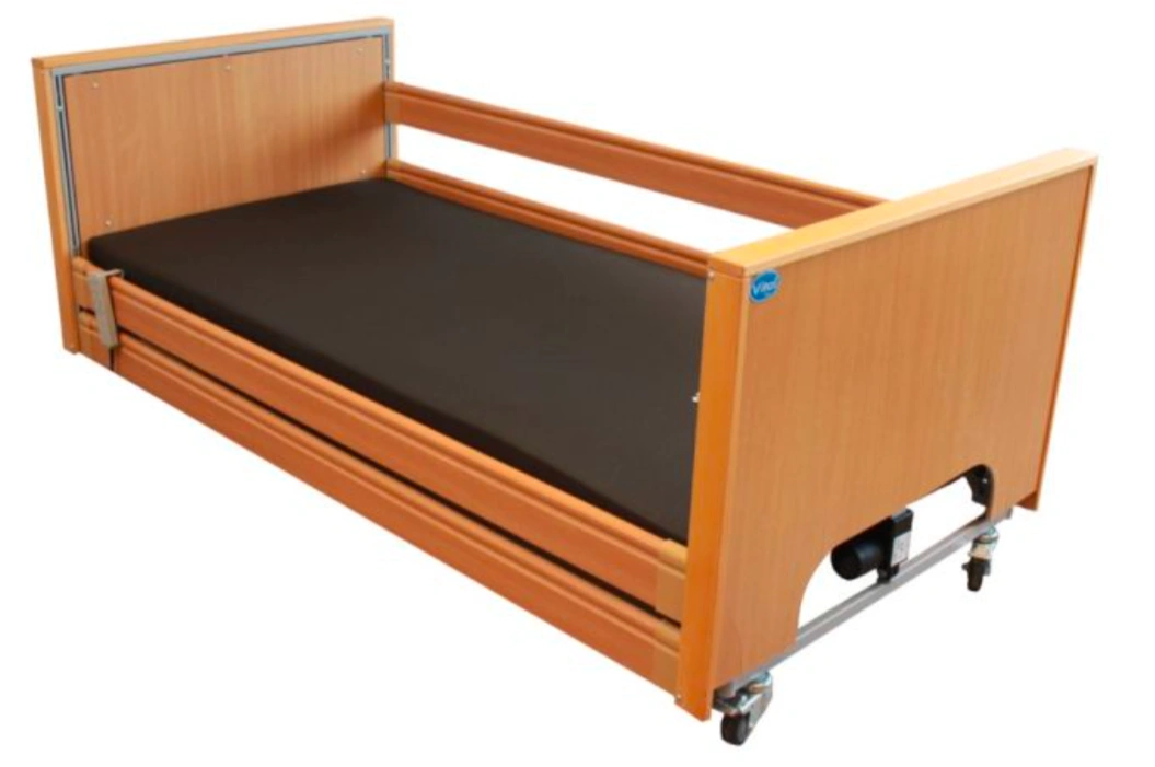 60VitalFlex Hospital bed. It has trendelenburg and reverse trendelenburg tilt position and comes with a therapeutic foam mattress (never used) as well as an airflow mattress to prevent bed sores (new cover required). The bed has full guard rails on both sides and is oak coloured.
