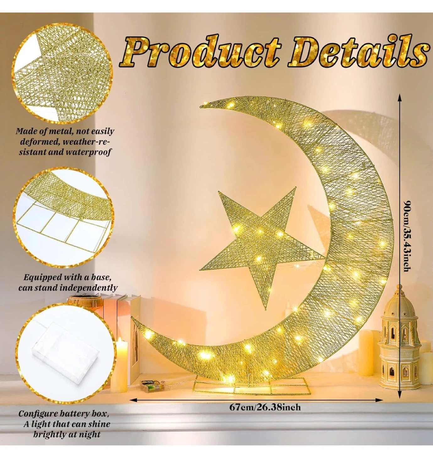 Pre-lit Ramadan Decorations for Home Metal Eid Star Moon Crescent Light Eid Mubarak Decorations Outdoor Lighted Night Lamp Sign with LED