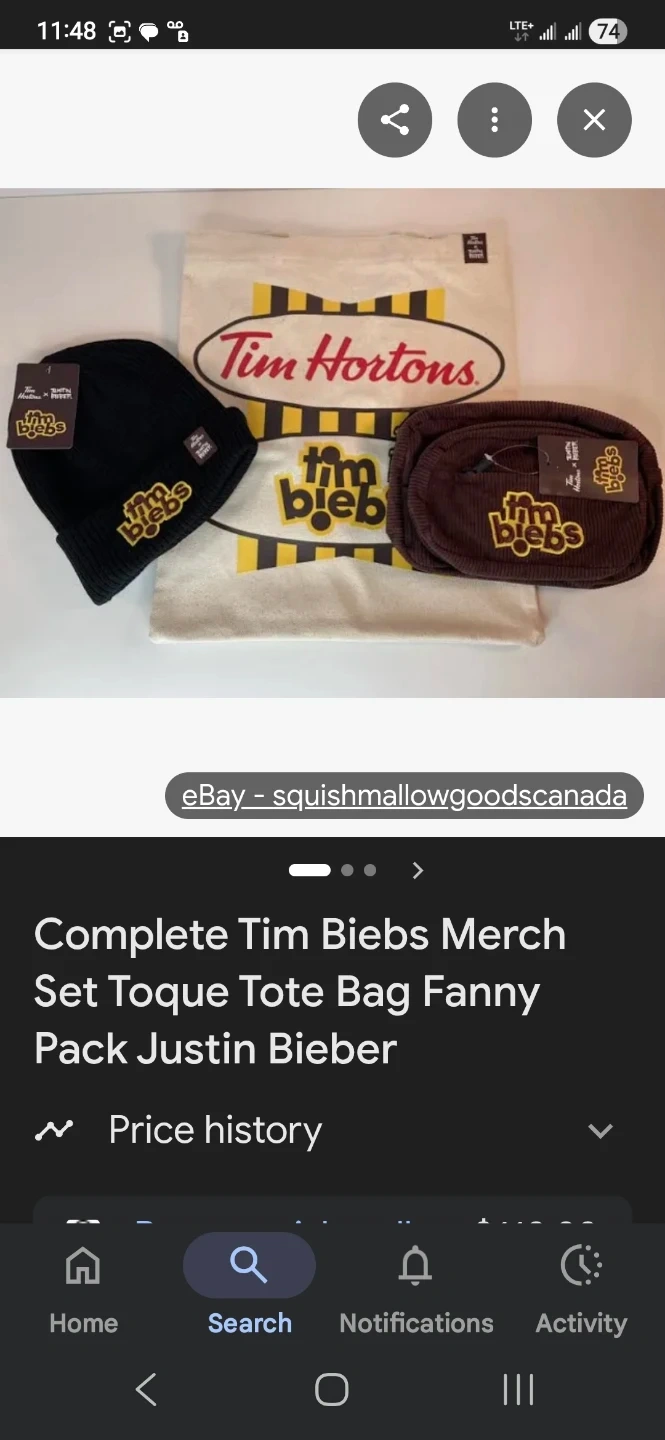 This Tim Hortons merch set features a black toque, a natural canvas tote bag, and a brown fanny pack, all with the 'Tim Bieb's' branding. It's a complete collection for fans of the collaboration. This set would be great for collectors or anyone looking for unique fan gear.
