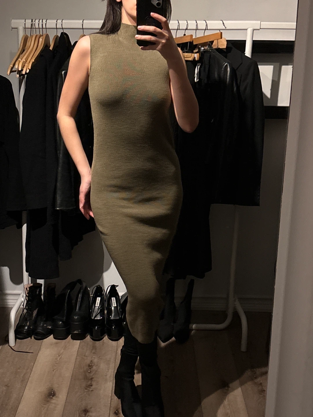 This Club Monaco sleeveless dress is made from a merino wool blend. It features a mock neck and a ribbed knit design. Size is XS/TP. Olive Green color. Excellent for layering or wearing on its own!