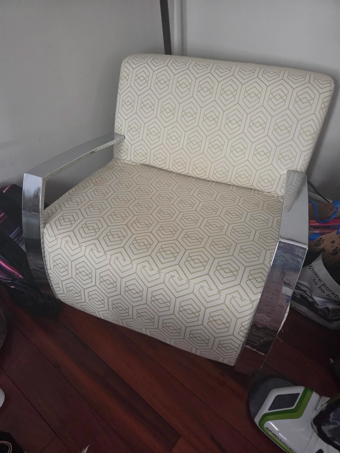 Stylish accent chair featuring a repeating geometric pattern in beige and gold. It has sleek chrome arms and a sturdy frame. Adds a touch of modern elegance to any room!