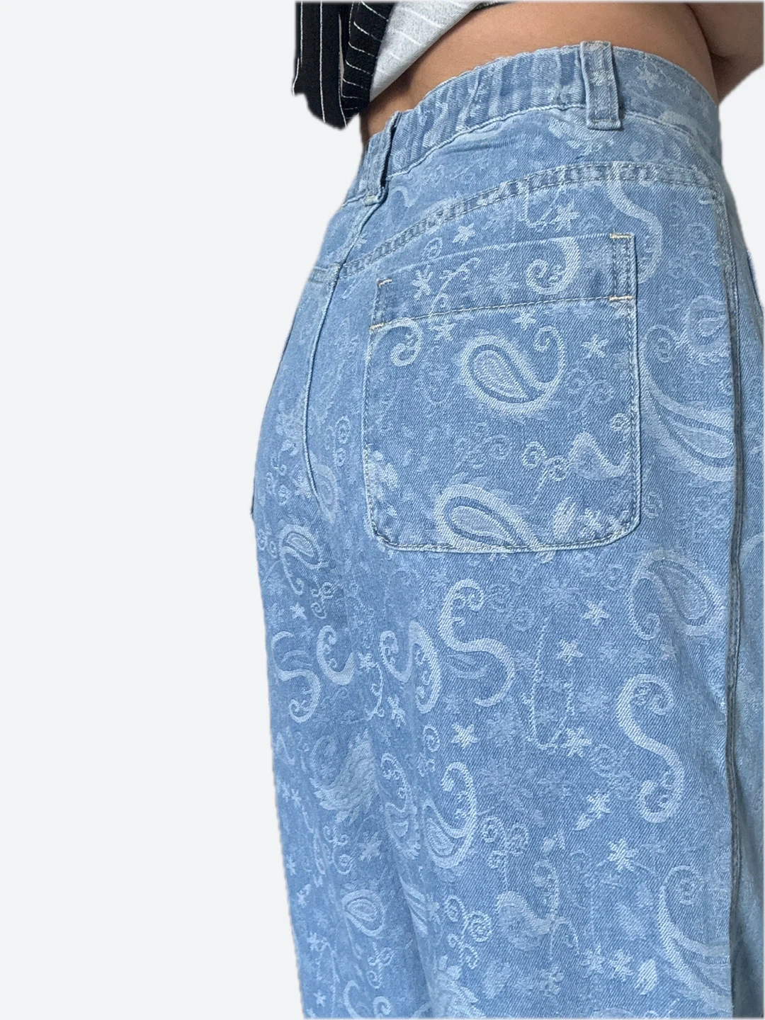Light wash denim jeans featuring a subtle all-over paisley print. They have a classic five-pocket design with decorative pearl and gold button accents. These jeans offer a unique vintage-inspired look.