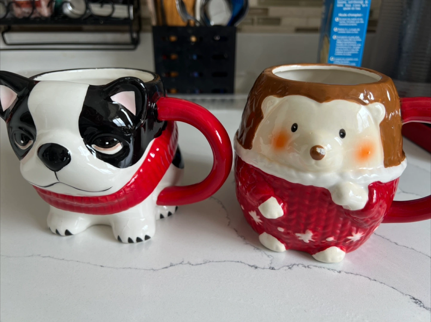 Cute ceramic mugs. Features a Boston Terrier and Hedgehog wearing red sweaters. Perfect for cozy mornings. Great gift idea. 2 for $5