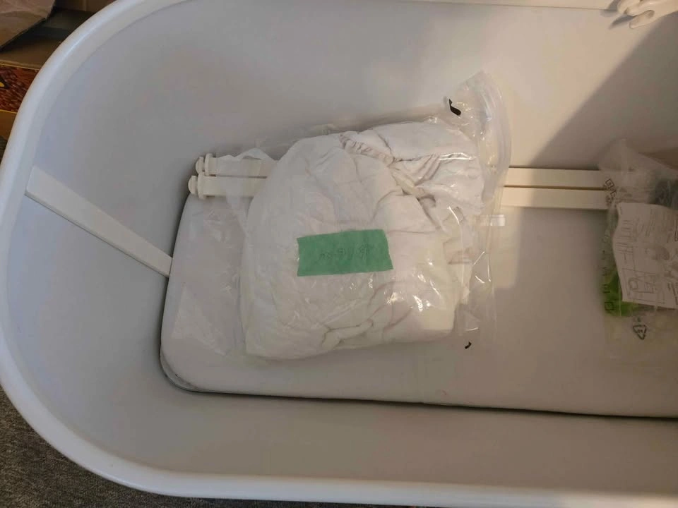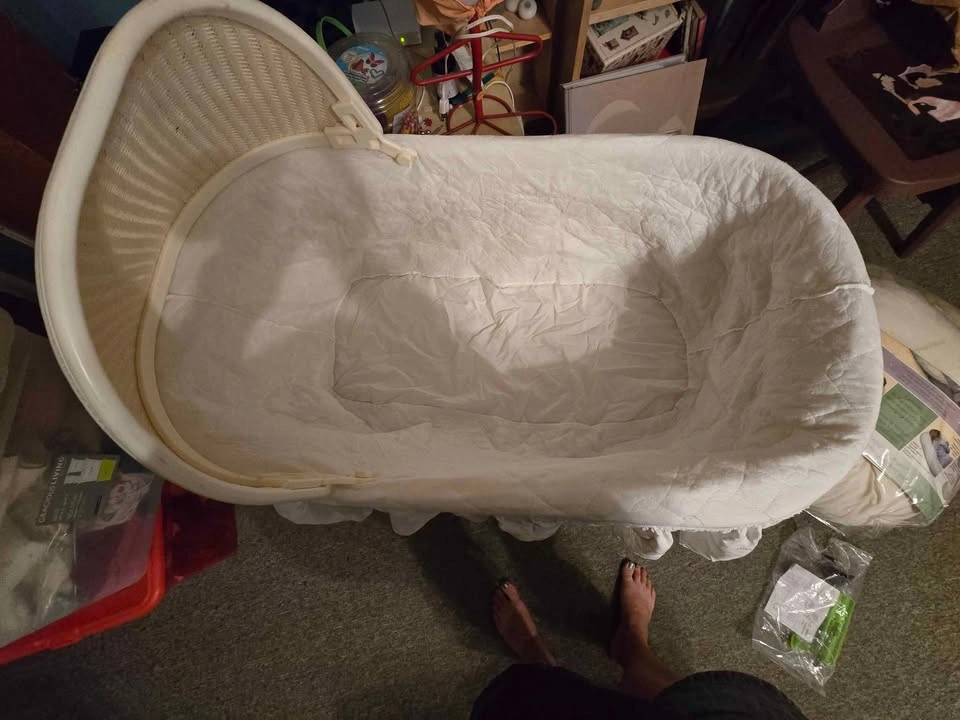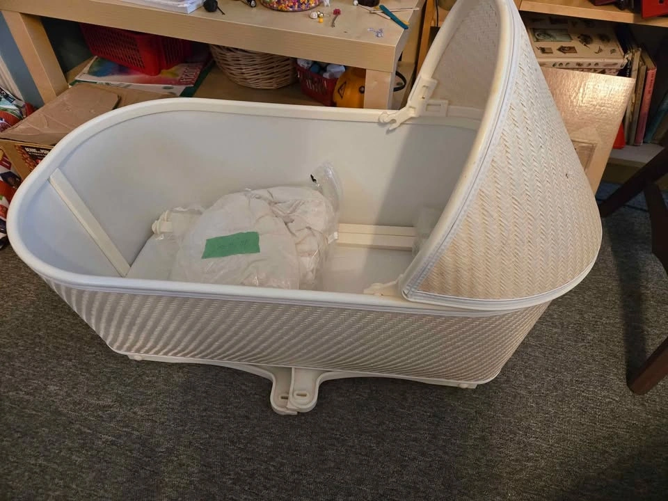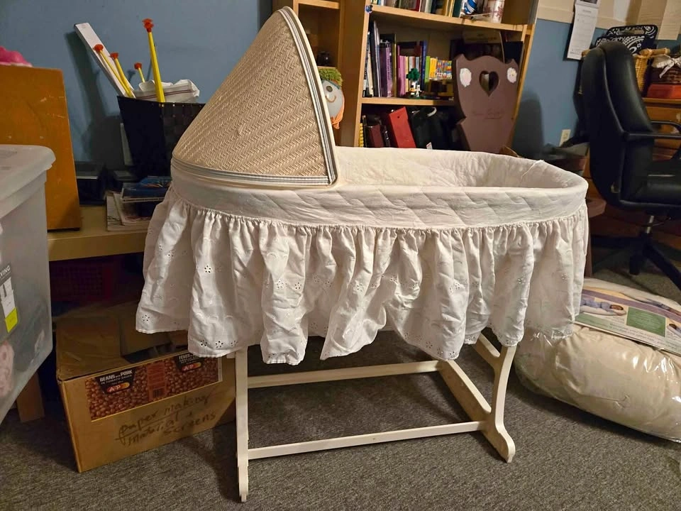 Gently used white bassinet for sale! This lovely bassinet features fold-down legs and a soothing rocking motion, perfect for helping your little one drift off to sleep. Includes a beautiful white eyelet cover, which has been carefully stored in a sealed bag to maintain its cleanliness and quality. A wonderful gift for new parents or a great addition to your own nursery! $20. Pick up in Chicopee.