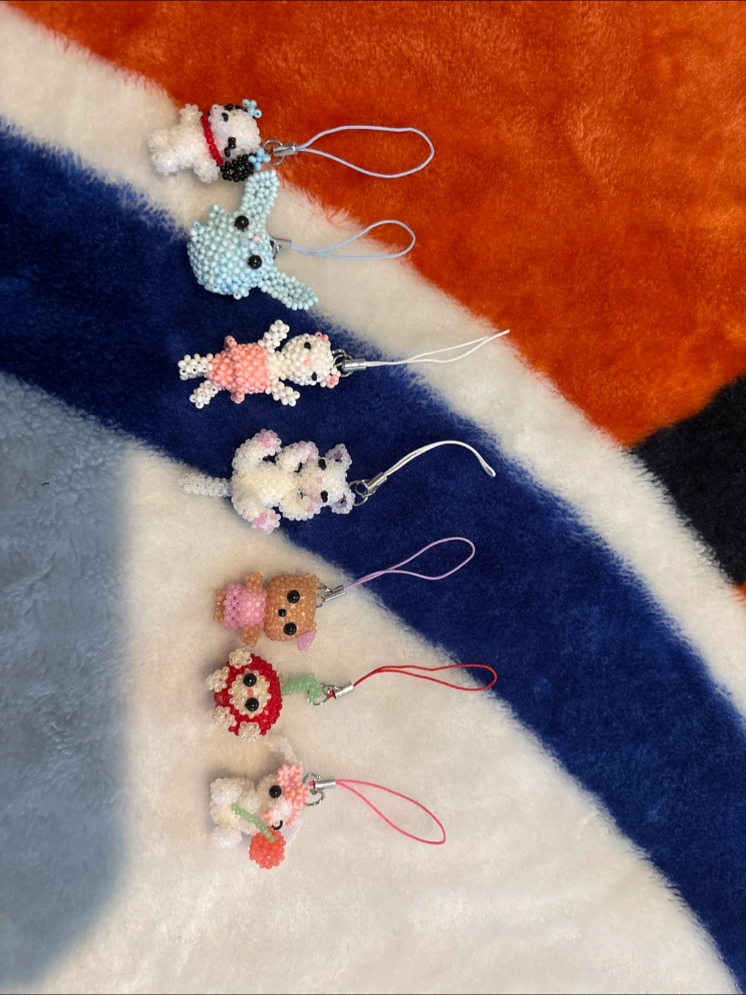 162Set of unique handmade beaded animal keychains. Perfect for bags or keys. Cute and colourful designs. Variety of animals including dogs, bunnies, bears, and more. Each keychain features a small beaded animal charm attached to a string. The first photo 5$ each,second photo 10$ each