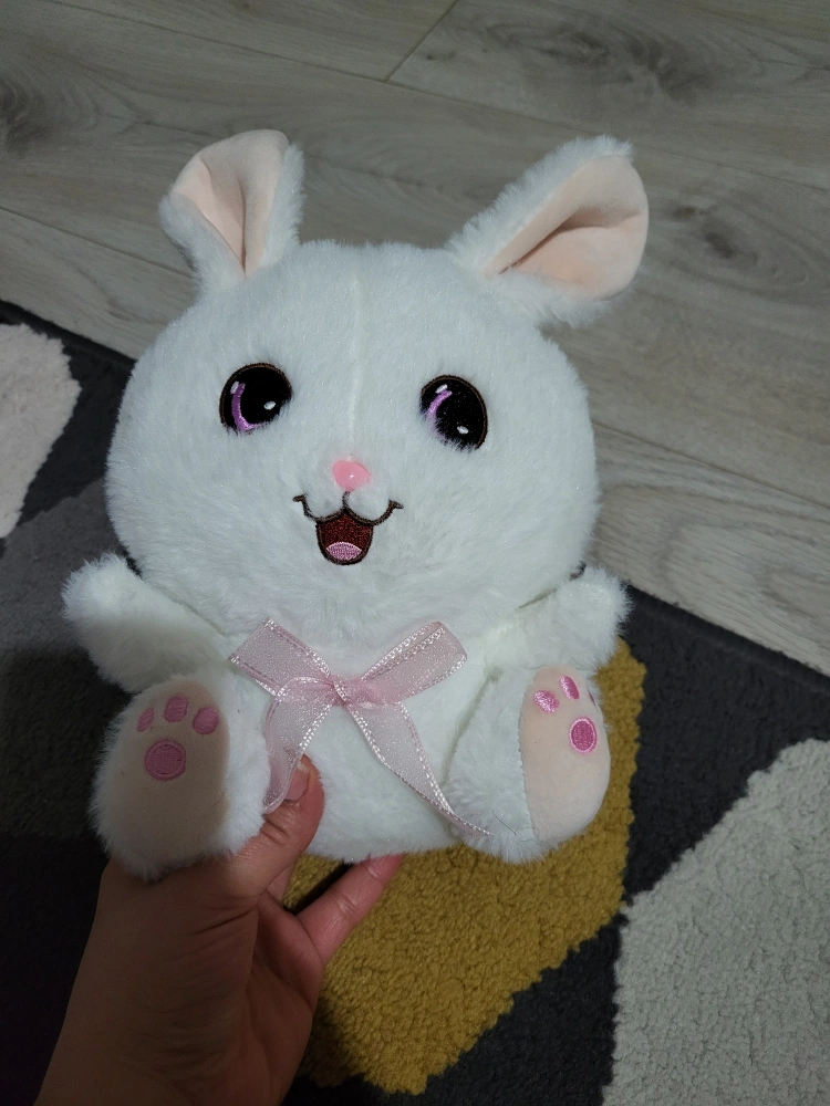 5Soft white bunny plush. Large eyes, pink nose, and pink paws. Features a pink ribbon bow. Great for cuddling.