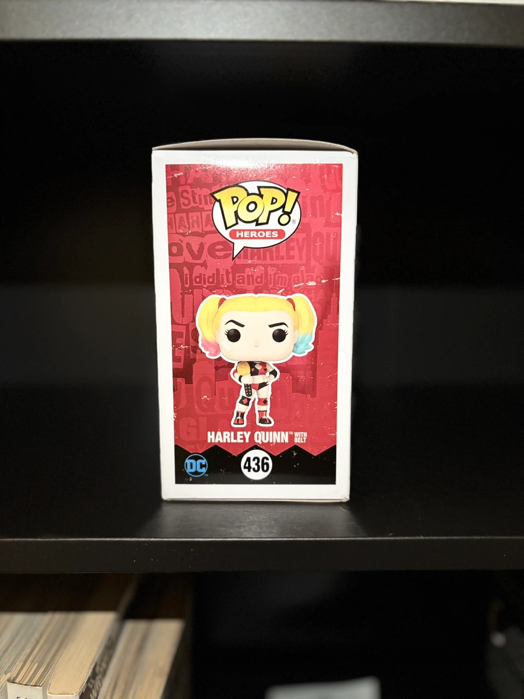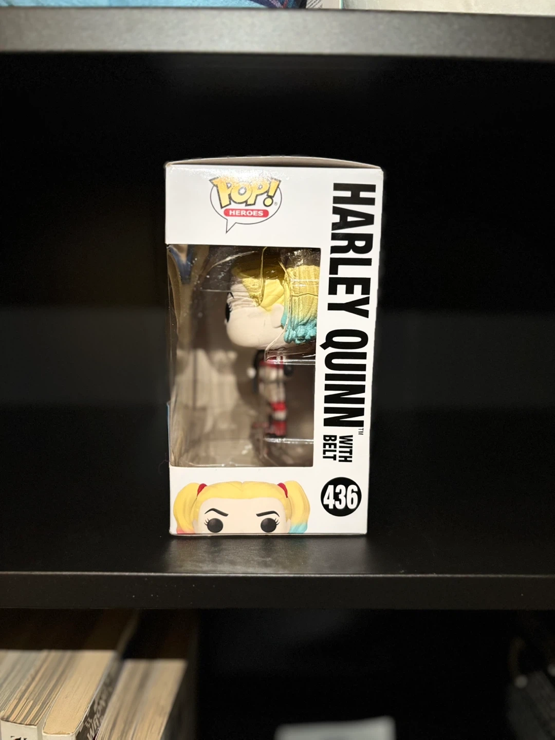 This is a Funko Pop! DC Heroes collectible vinyl figure of Harley Quinn, number 436. It's part of the Super Heroes line. The figure comes in its original box.