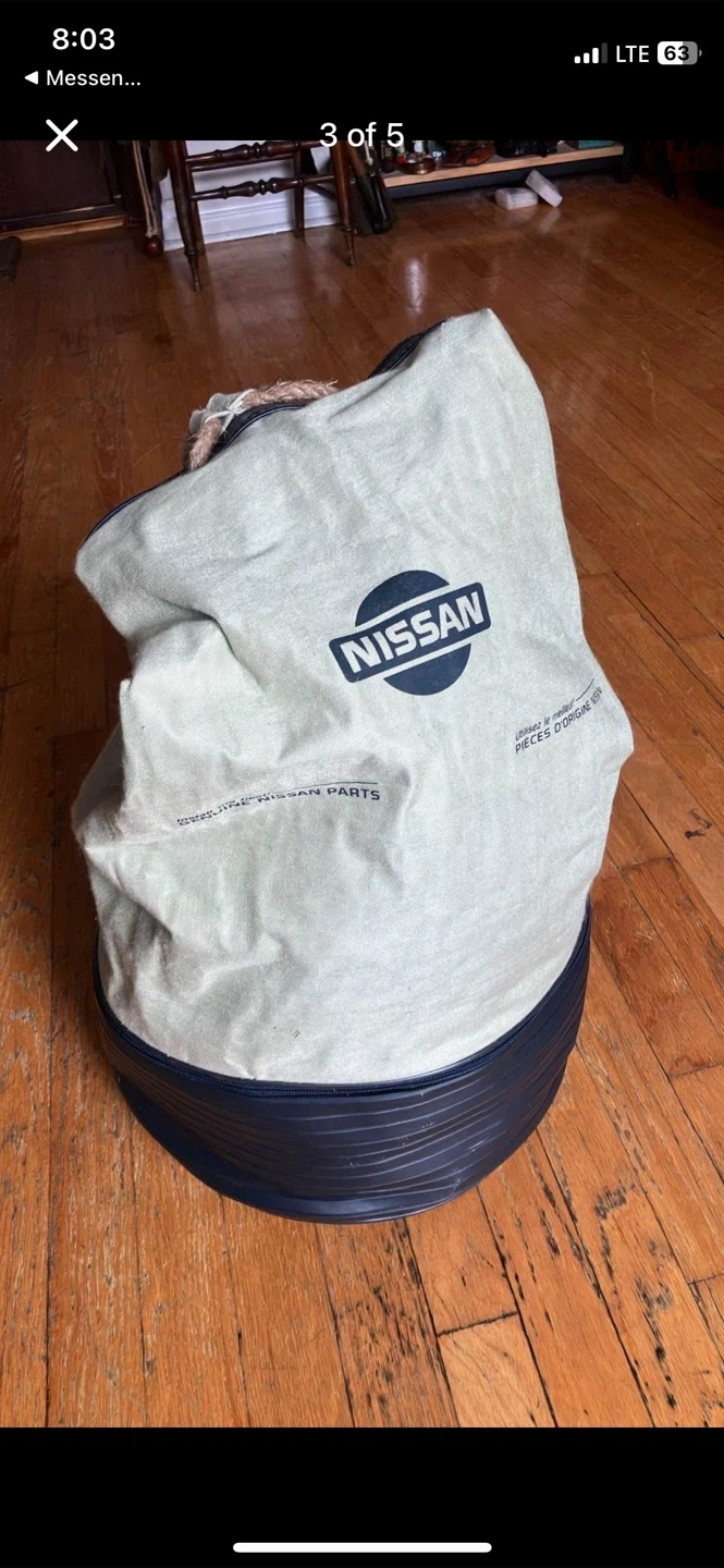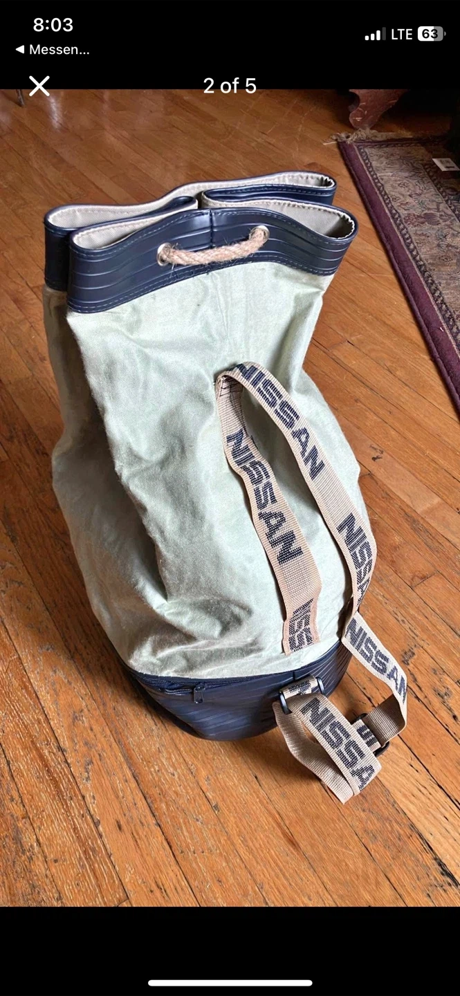 Here's a drawstring bag with the Nissan logo on it. It has a unique design with the Nissan logo on the front and straps. The bag is in good condition and ready for use!