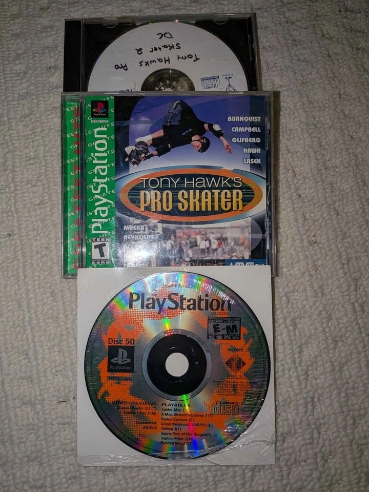 Includes power adapter, memory card, one controller, Tony Hawk Pro Skater 1, Tony Hawk Pro Skater 2, and one demo disc with a few pre-installed game demos. Feel free to message if you have any questions!