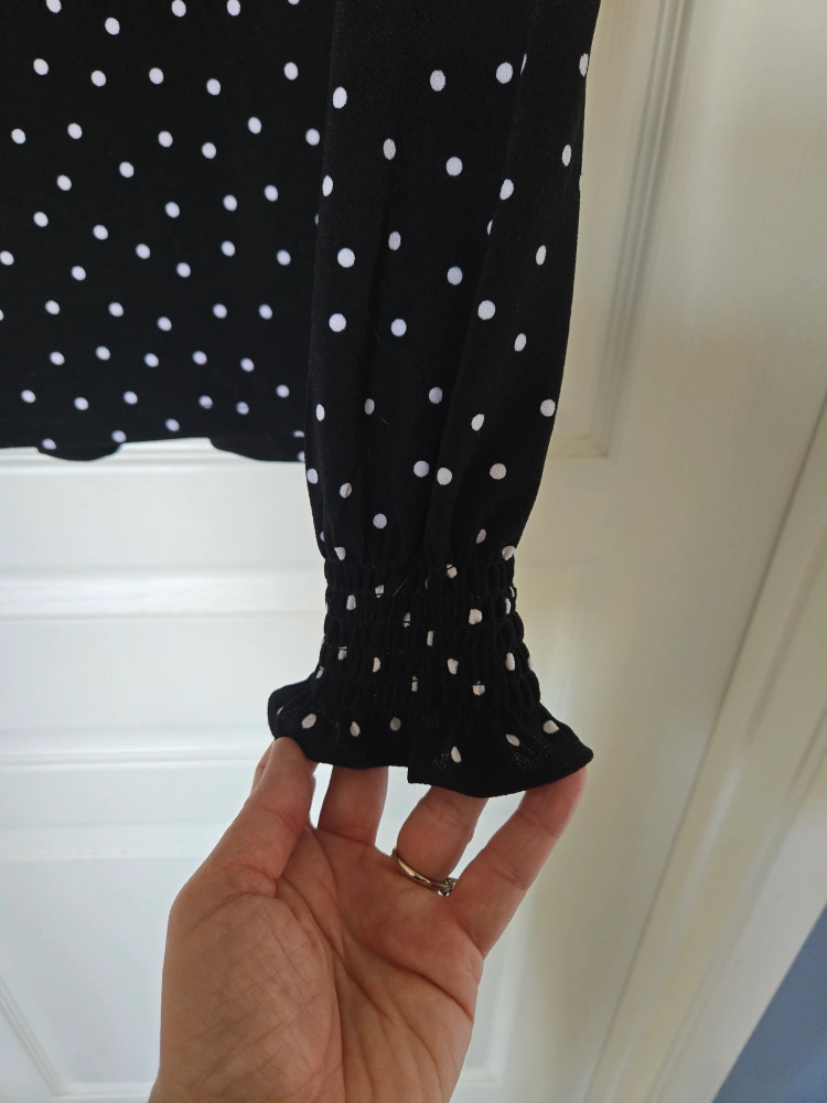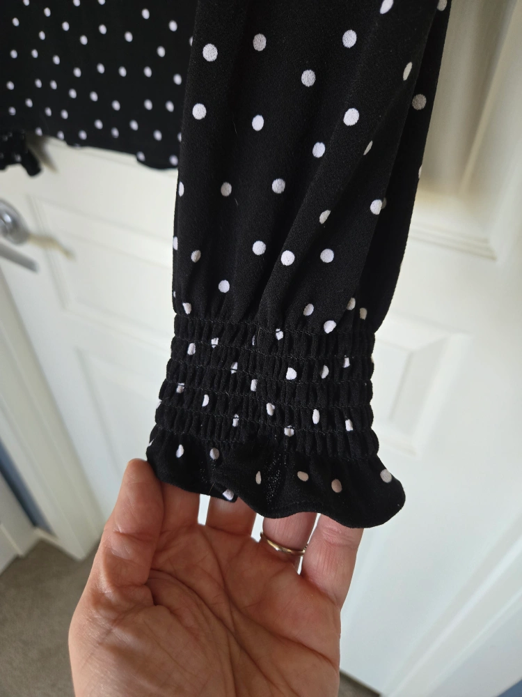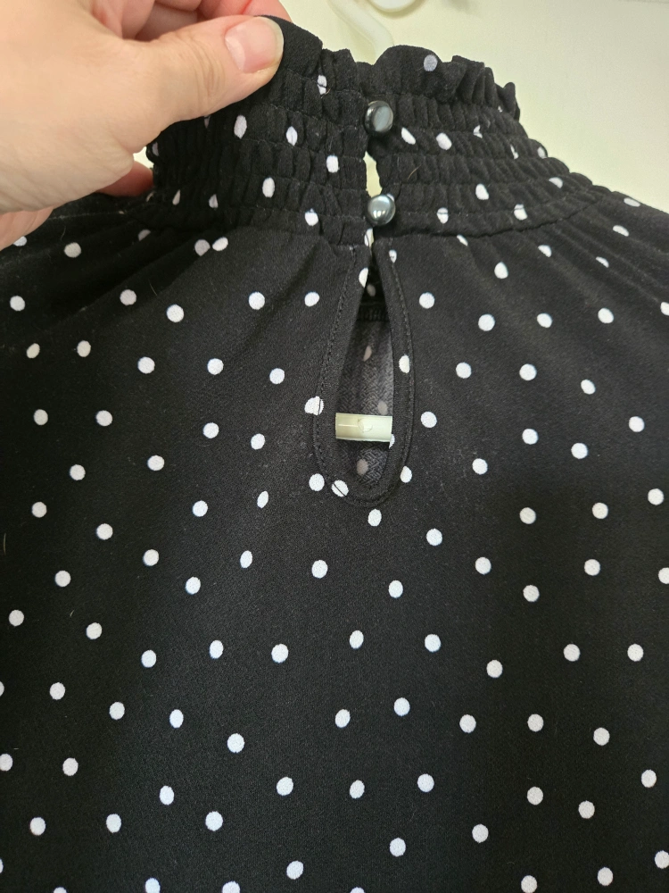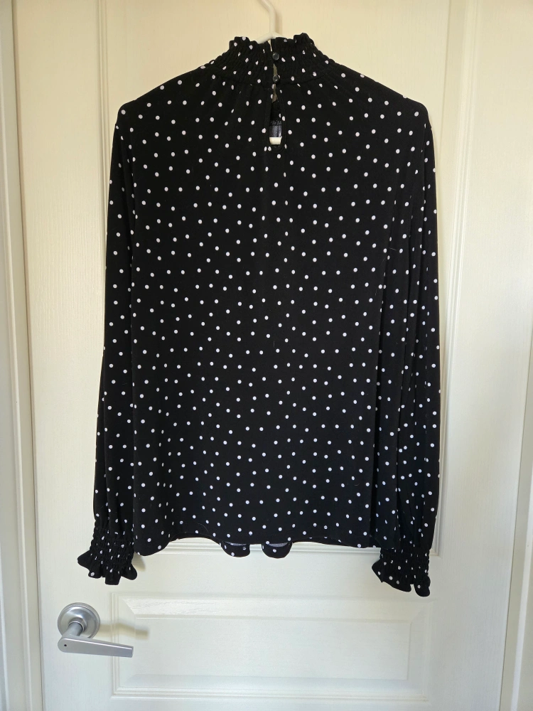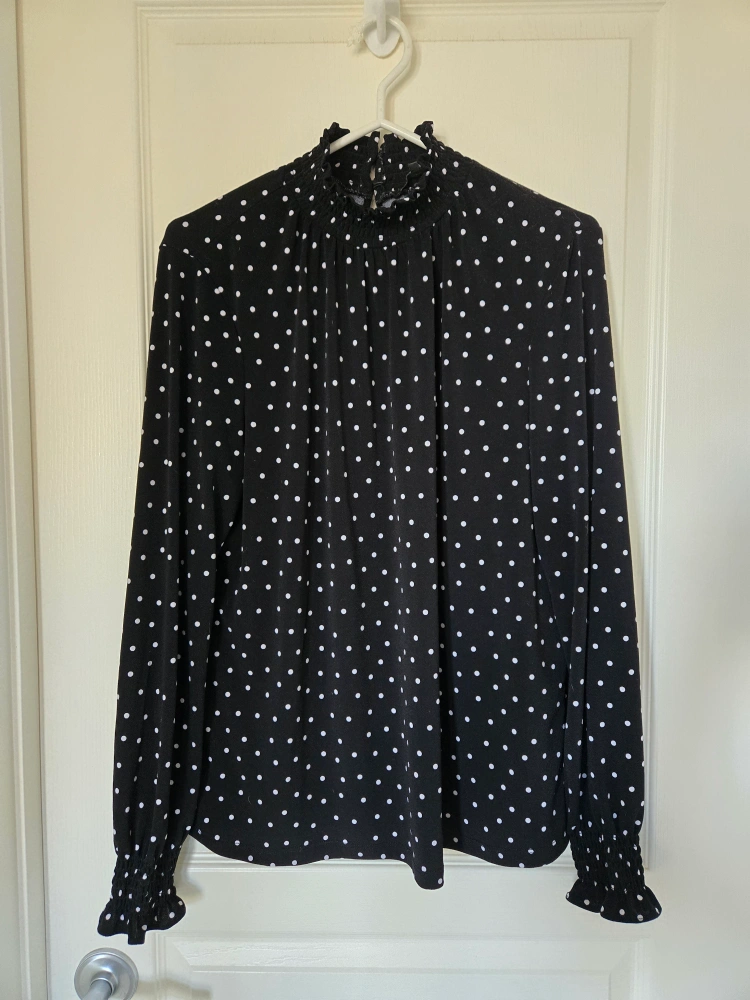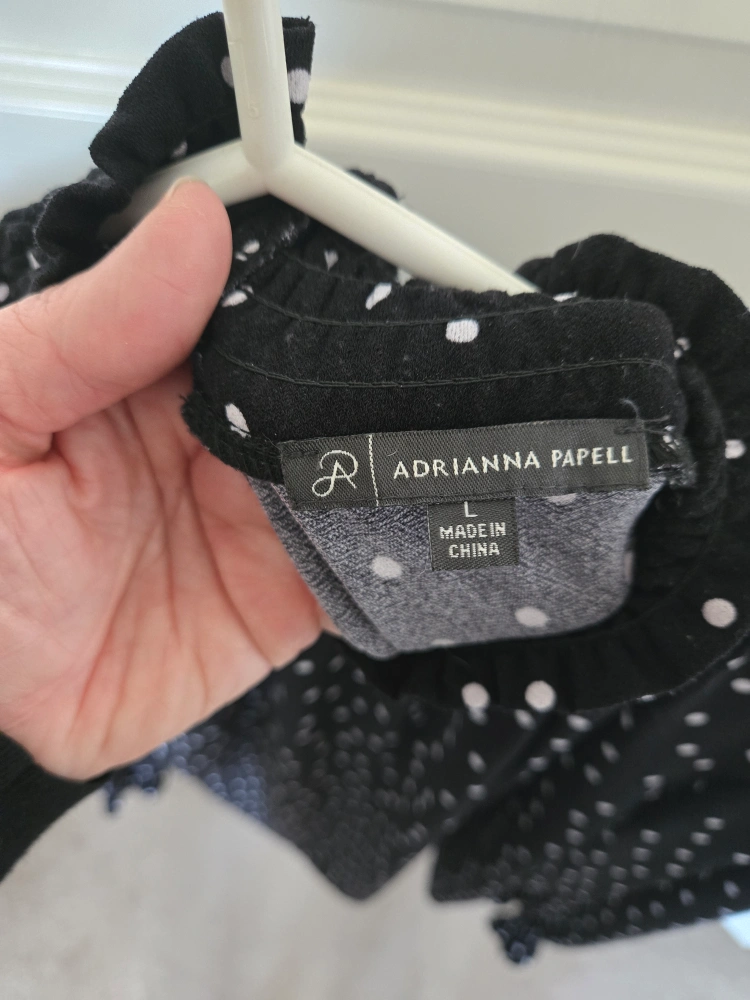 A cute and stylish Adrianna Papell blouse! It features a black background with white polka dots, long sleeves with ruffled cuffs, and a high neckline. Keyhole back button. Stretchy. Size L. Pet Friendly and Smoke-free Home