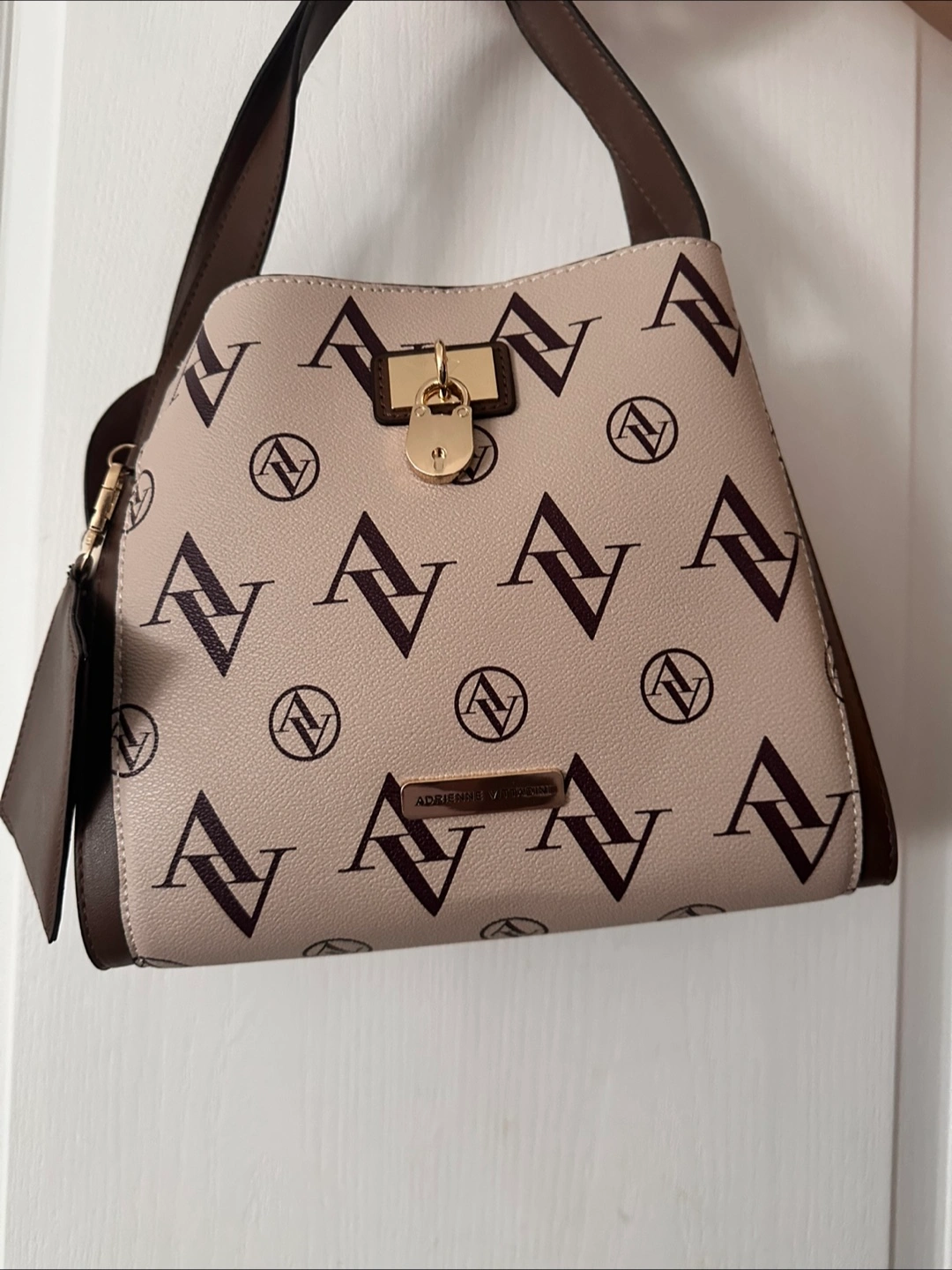 Stylish Adrienne Vittadini bucket bag in excellent condition! The bag features a unique monogram pattern and a chic lock detail. Perfect for adding a touch of elegance to any outfit. Never used. Just not my style preference.