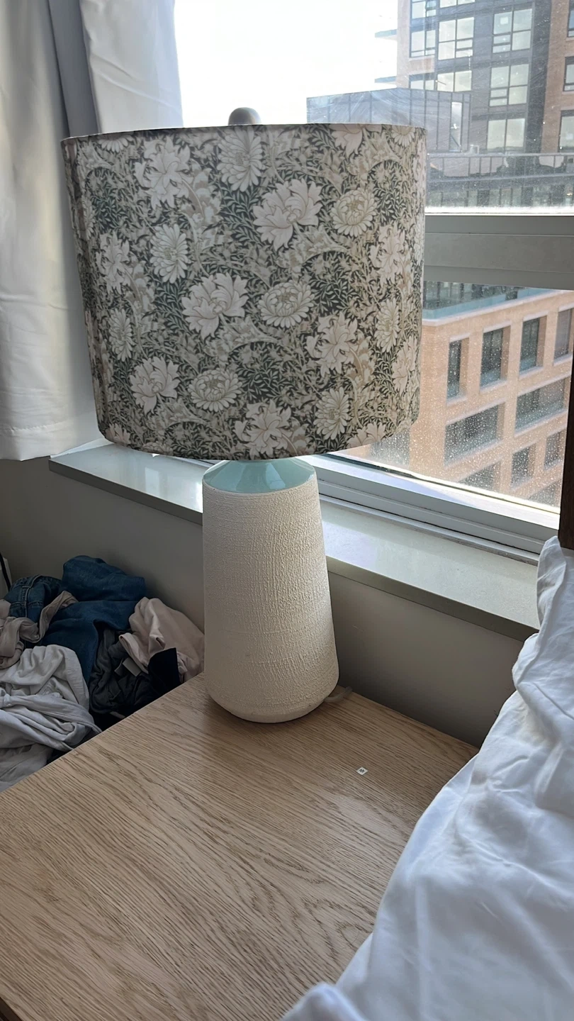 Stylish table lamp featuring a fabric shade with a detailed floral pattern. It has a textured ceramic base in a cream colour and a light blue accent near the top. This lamp is great for adding ambient lighting to a bedroom or living space.