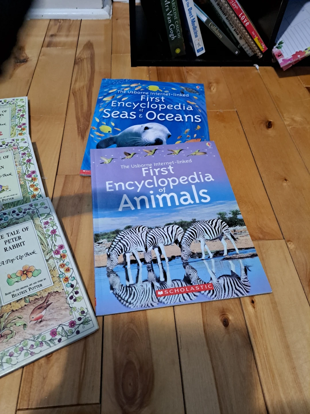Collection of Usborne Internet-linked First Encyclopedia of Seas & Oceans and First Encyclopedia of Animals. Also includes Beatrix Potter pop-up books and Curious George's Dinosaur Discovery. These books are great for engaging young readers with educational and fun content.