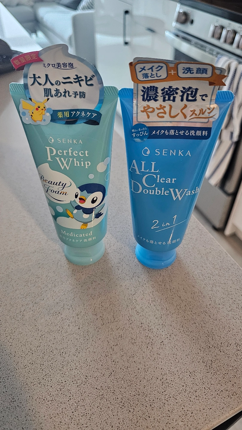 Two tubes of Senka facial wash. One is Perfect Whip Beauty Foam, medicated acne care. The other is All Clear Double Wash, 2-in-1 makeup remover and cleanser.