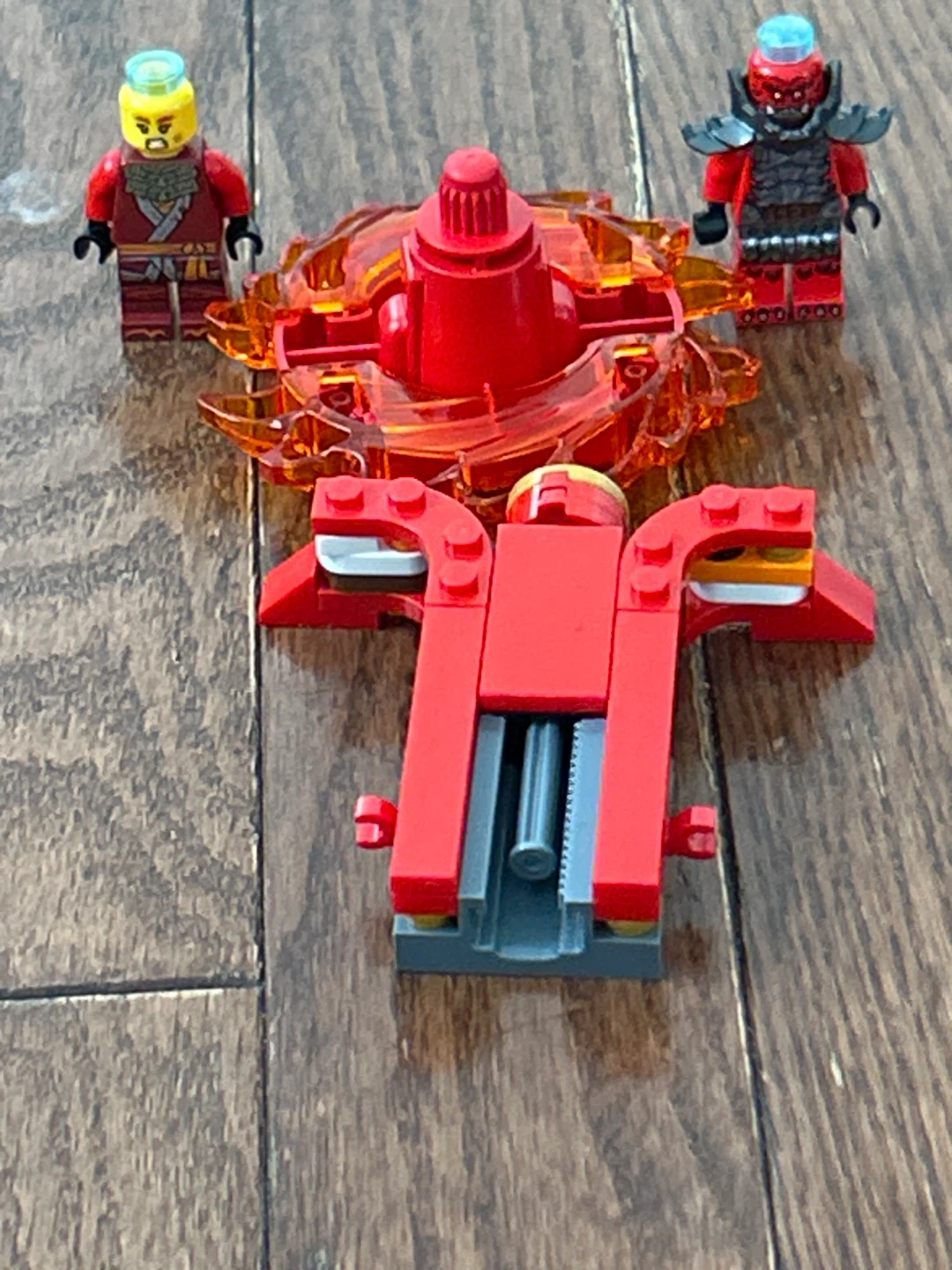 This set includes two LEGO Ninjago minifigures and two spinning accessories. It's made of plastic and is perfect for imaginative play. Great for kids who love action figures!